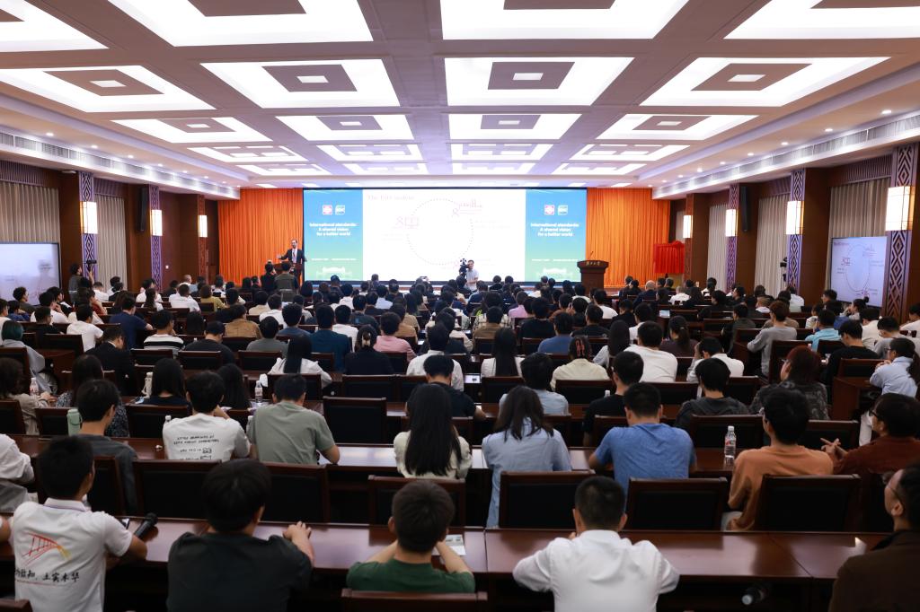 揭牌仪式前,穆希卡为Ky开元集团等高校的200余名师生代表作题为“国际标准:为了一个更美好的世界的共同愿景”的主旨演讲,并与活动现场师生代表就如何参与ISO国际标准制定、国际标准化人才培养、标准化在减少碳排放方面的贡献等话题进行交流互动。