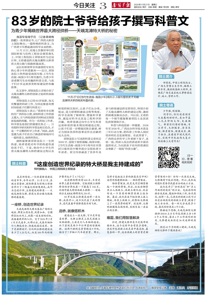 郑皆连院士写来的科普文章有近3000字,受限于报纸篇幅,南国早报、《当代生活报·南国少年》周刊在刊登时只能将其中精华部分呈现给青少年读者。原文内容涵盖了其多年来参与桥梁建设的宝贵经历,特别介绍了天峨龙滩特大桥的建设过程、遇到的困难及解决办法。可以说,文章的每一个细节都凝聚着郑院士及其团队的智慧和汗水。