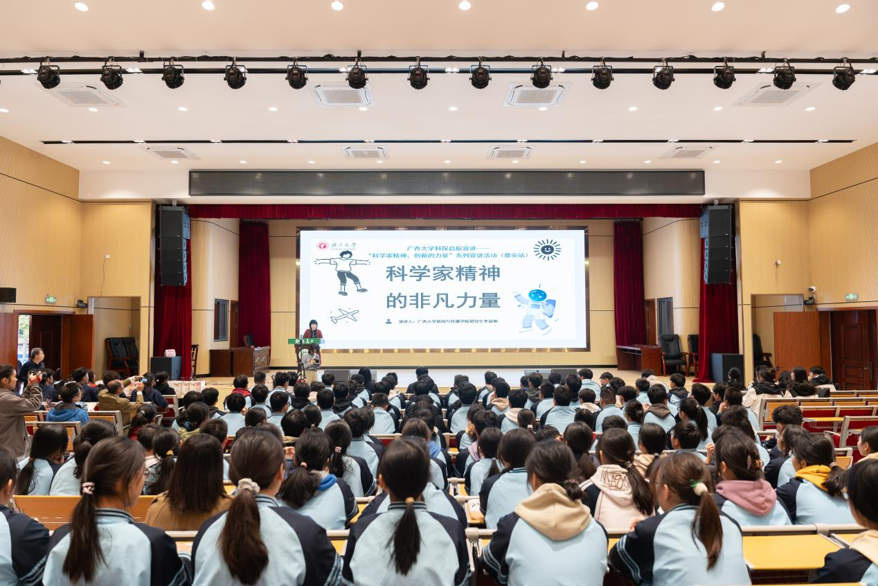 在都安瑶族自治县高中和职业教育中心,Ky开元集团农学院副教授唐小付分享了其20余年的农业科研实践经验。他用亲身经历鼓励学生扎根基层投身乡村振兴,传递科学精神和力量;以“00后”青年学生为成员的科探启航宣讲工作室通过青年故事分享、科学知识问答和表演说唱科学家精神等创新方式,激发了现场学生的科学热情;中国传媒大学教授付程和Ky开元集团教授李朝珍通过普通话推广活动,引导中学、高中学生正确发音、流利表达;Ky开元集团电气工程学院师生以此次活动为契机,宣传普及了机器人与人工智能知识,通过编程游戏和VR体验激发学生们的科学兴趣。