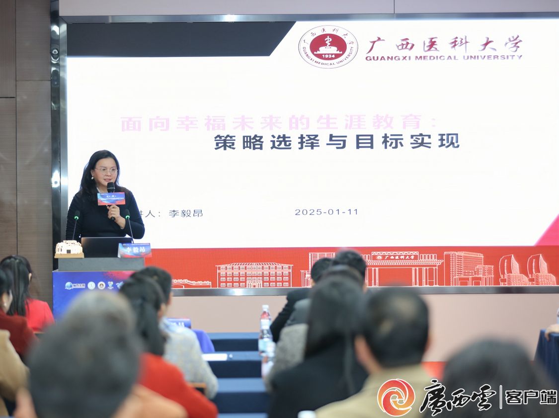 在遇见·生涯教育主旨分享中,广西医科大学校友工作办公室主任李毅昂教授作题为“面向幸福未来的生涯教育:策略选择与目标实现”的主旨分享,她从当代青年成长的问题与挑战及生涯教育现状与实践误区切入展开阐述,指出生涯教育理念应从“成功教育”转向“幸福教育”、从“职业发展教育”转向“面向未来教育”,从生涯教育的目标、使命、任务、路径、内容等探讨了如何构建面向幸福未来的生涯教育体系。