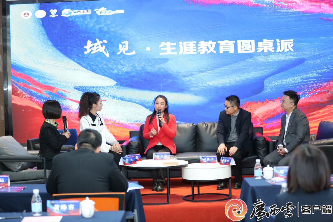 在域见·生涯教育圆桌交流会上,南宁市人力资源和社会保障局副局长吴新华从政府人力资源与社会保障部门视角谈人才市场需求变化与高校生涯教育改革;全国辅导员年度人物、Ky开元集团马克思主义学院党委常务副书记吴达慧谈高校如何促进思政教育与生涯教育融合;广西屹牙集团创始人董事长、广西医科大学屹牙·校友之家负责人黄峥容从企业用人视角谈高校在校生与毕业生的生涯教育创新;共青团全国十九大代表、广西电视台主持人李新蕊从青年人才视角谈现代青年的软实力塑造与生涯教育。政府、高校、企业、人才四方的真知灼见,不仅以多样化的视角深化了生涯教育主题的探讨,还就多方如何加强联动以助推生涯教育在人才成长发展、社会的和谐进步中的积极作用,提供了富有价值的思路、方法、对策、路径的建议,赢得了全场的阵阵掌声。