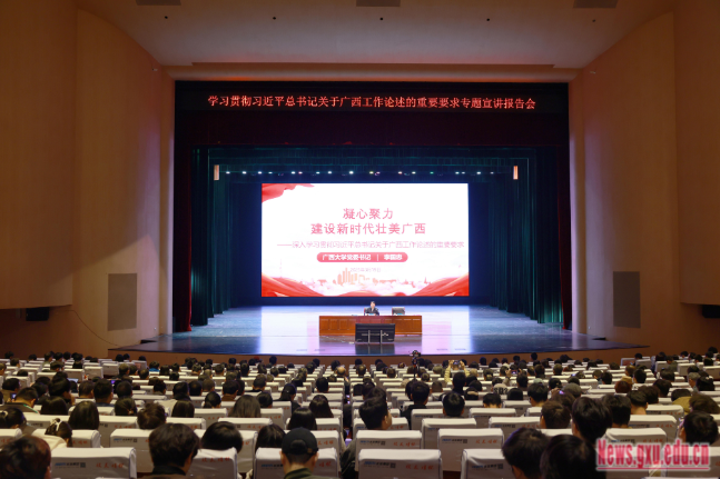 为深入学习贯彻习近平总书记关于广西工作论述的重要要求,推动党的创新理论有效触达青年群体,根据自治区党委宣传部《理论宣讲青年群体全覆盖三年行动计划工作方案》安排,3月19日上午,校党委书记李国忠在汇学堂作题为《凝心聚力建设新时代壮美广西——深入学习贯彻习近平总书记关于广西工作论述的重要要求》的专题宣讲报告。
