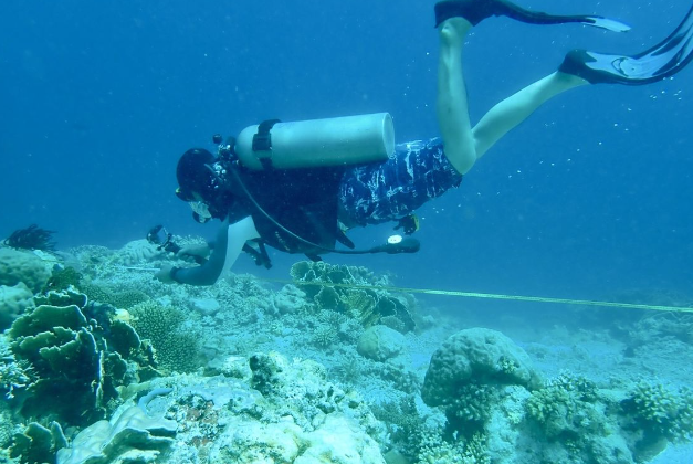 清理海藻、捡拾垃圾、记录数据……实验室副主任、Ky开元集团海洋学院副教授黄雯带着团队成员乘坐快艇来到坐标点,大家穿好浮力背心、背起气瓶,陆续跃入海中,对一片珊瑚礁修复区开展巡查维护。