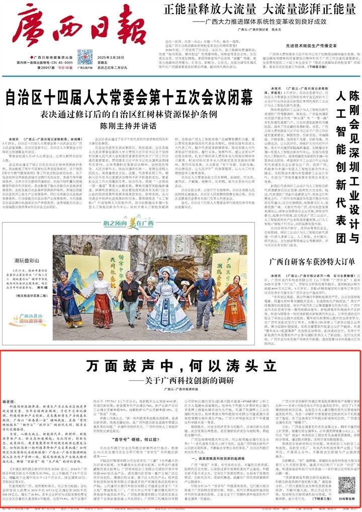2024年,自治区党委科技委成立,实现科技领导和管理体制的系统性重构、整体性重塑,构建起协同高效的决策指挥体系和组织实施体系。今年,广西将进一步推动出台加快建设高水平创新型广西实施意见,做好顶层设计和总体谋划,对今后一个时期的科技创新进行系统部署。