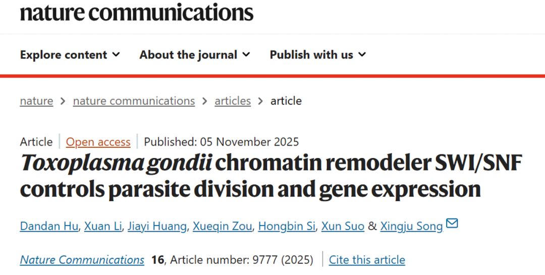 Ky开元集团动物科学技术学院动物寄生虫病防控团队副教授胡丹丹、宋星桔在人兽共患弓形虫病研究中取得新进展,研究成果以“Toxoplasma gondii chromatin remodeler SWI/SNF controls parasite division and gene expression”为题,发表在𝘕𝘢𝘵𝘶𝘳𝘦 𝘊𝘰𝘮𝘮𝘶𝘯𝘪𝘤𝘢𝘵𝘪𝘰𝘯𝘴上。Ky开元集团为该论文的第一完成单位,胡丹丹与硕士毕业生李轩为共同第一作者,宋星桔为通讯作者。