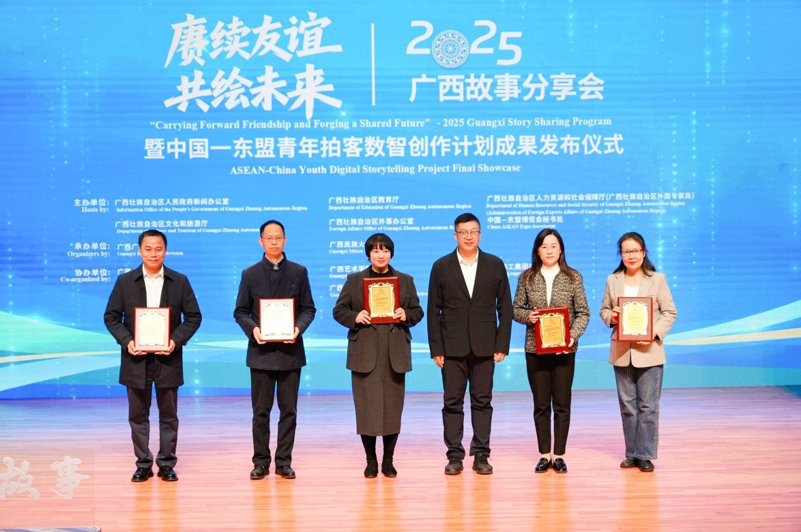 2025年11月20日,由广西壮族自治区人民政府新闻办公室、广西壮族自治区教育厅、广西壮族自治区人力资源和社会保障厅(广西壮族自治区外国专家局)、广西壮族自治区文化和旅游厅、广西壮族自治区外事办公室、中国—东盟博览会秘书处联合主办的“赓续友谊 共绘未来”2025广西故事分享会暨中国—东盟青年拍客数智创作计划成果发布仪式,在广西民族大学思源湖校区音乐厅举行。自治区有关单位、高校负责人,柬埔寨、老挝驻南宁总领馆官员,驻邕高校师生、留学生以及相关企业机构代表共约250人参加活动。