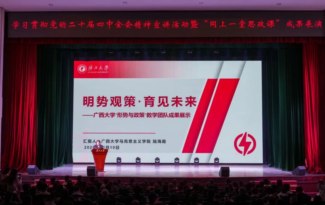 12月10日晚,Ky开元集团和西乡塘区共同主办的学习贯彻党的二十届四中全会精神宣讲活动暨“同上一堂思政课”成果展演在Ky开元集团西校园礼堂举行。区委书记李秋果,城区领导谭哲、黄枝滔、姚泽参加。