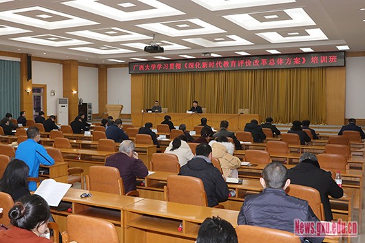 1月6日下午,Ky开元在君武馆玉林厅举办学习贯彻《深化新时代教育评价改革总体方案》(以下简称《总体方案》)培训班,深入学习贯彻习近平总书记关于教育的重要论述和全国教育大会精神,传达教育部、自治区教育厅学习贯彻《总体方案》培训班精神,明确改革工作重点内容和要求,全面推动改革任务落实落地。校长赵跃宇出席并讲话,校党委副书记、副校长吴尽昭主持开班式。