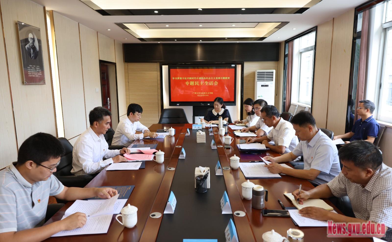 王乃学在会上作点评讲话。他表示,本次专题民主生活会认真贯彻落实了中央部署和学校党委的要求,主题明确,程序规范,组织周密,效果良好,达到了“团结-批评-团结”的目的,是一次严肃认真、民主团结、求真务实的党内政治生活实践。他强调,此次专题民主生活会的成效,最终要落实在持续深化学习上、落实在问题整改上、落实在服务广西建设西大风格、广西特色、中国气派、世界一流的中国特色社会主义大学上。他要求,学院党委班子要坚持对党忠诚,不断增强坚定拥护“两个确立”、坚决做到“两个维护”的思想自觉、政治自觉和行动自觉,在提高政治站位、政治意识、政治思维、政治能力上作表率,在把学院建设成为马克思主义理论与习近平新时代中国特色社会主义思想的传播地与影响源上发挥更大作用。要坚持勤学勤思,持续强化理论武装,认真贯彻落实好“第一议题”制度,把紧跟时事政治的学习做实做细,切实做到真学真信真懂真用,增强使命感,厚植家国情怀,涵养吃苦耐劳的优良学风与作风,为建设牢牢扎根八桂大地的中国特色“双一流”大学奠定坚实的思想基础。要坚持履职担当,激发干事创业动能,牢牢聚焦学校争创全面一流十大工程,把开展主题教育同贯彻落实学校党委重大决策部署结合起来,精准定位学院特色与比较优势,建设一批“金专”“金师”“金课”,着力打造马克思主义理论教育教学、研究宣传和人才培养的坚强阵地,推动学院建设高质量发展。要进一步建立和完善基层党支部作业本,通过基层问题留作业,基建党建做作业,基层筑牢判作业,把问题解决在基层。要坚持问题导向,压实整改责任,带头抓好问题整改,坚持“当下改”与“长久立”相结合,扎实做好民主生活会“后半篇”文章。