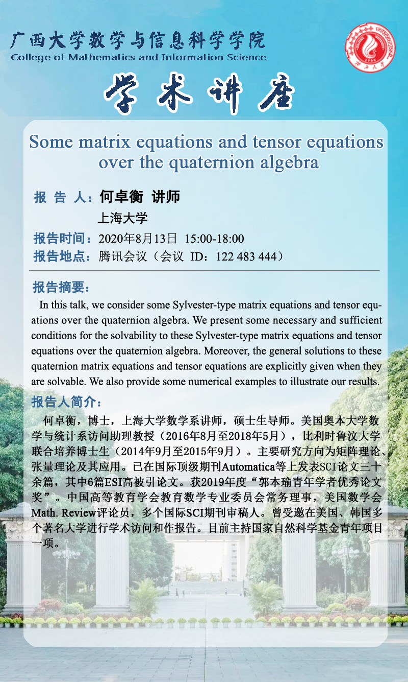 数信学院学术海报:Some matrix equations and tensor equations over the quaternion algebra
