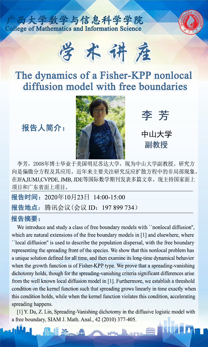 数学与信息科学学院学术讲座:The dynamics of a Fisher-KPP nonlocal diffusion model with free boundaries