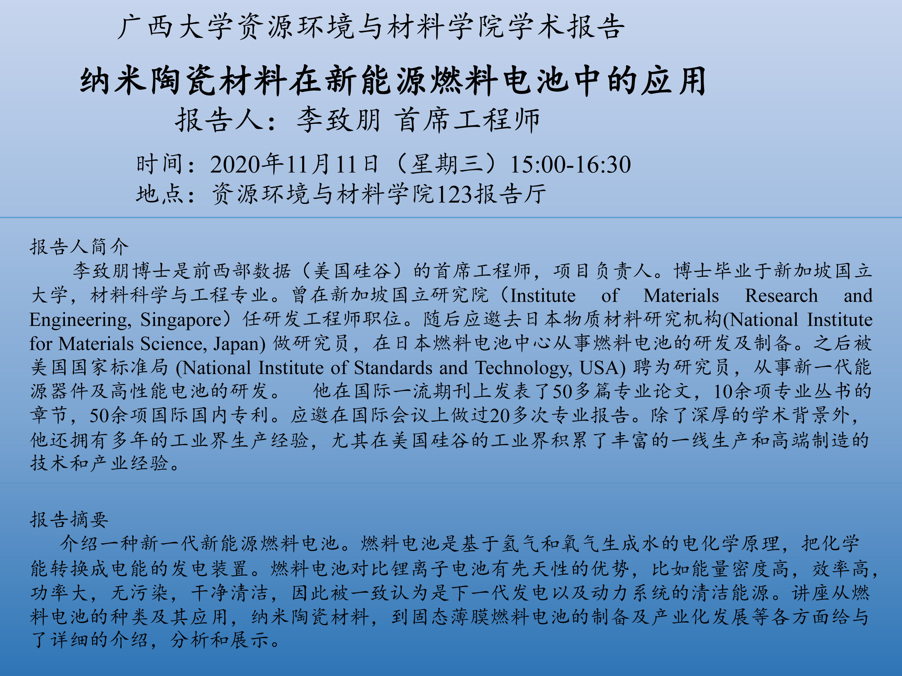 资源环境与材料学院学术报告:纳米陶瓷材料在新能源燃料电池中的应用