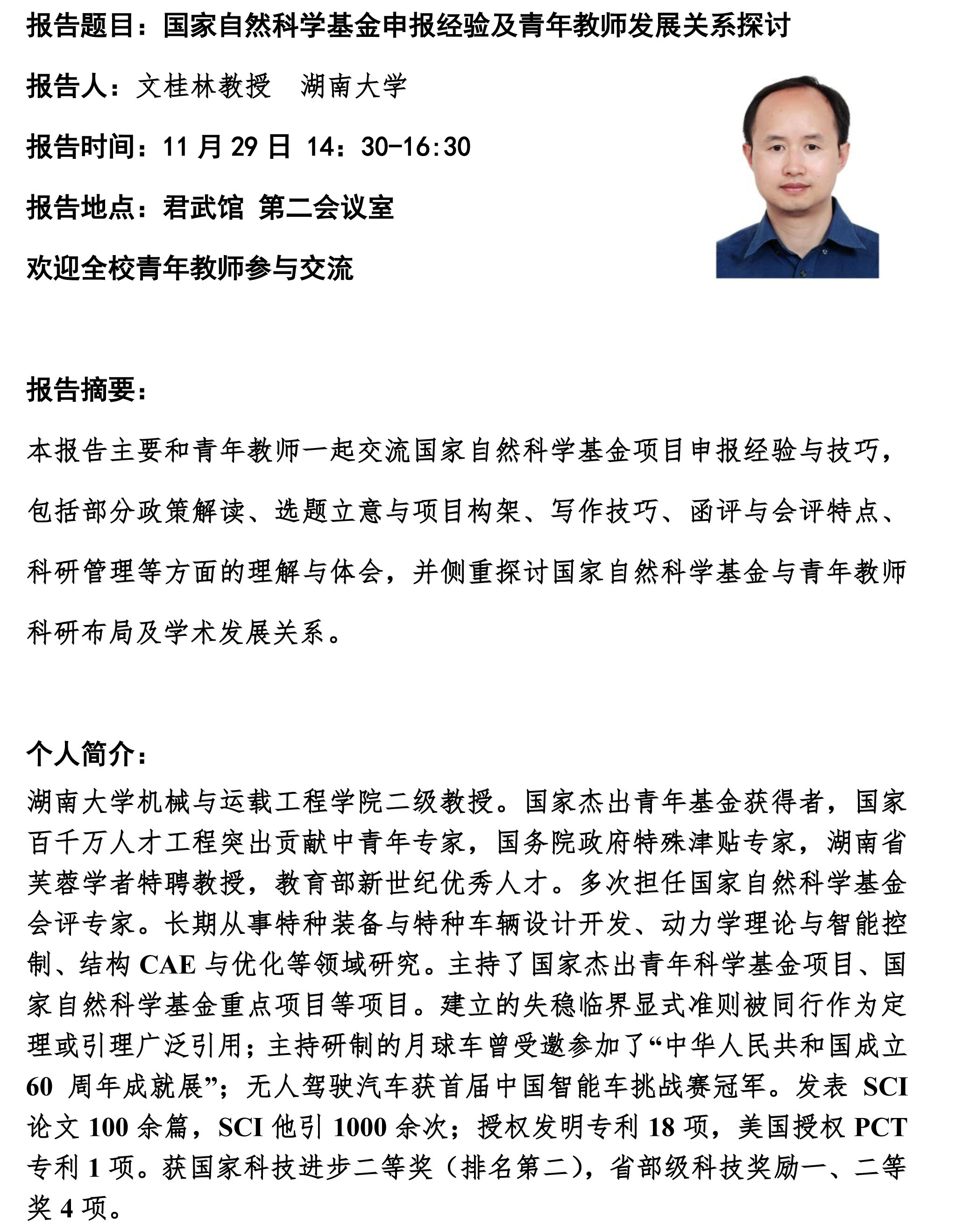 报告题目:国家自然科学基金申报经验及青年教师发展关系探讨