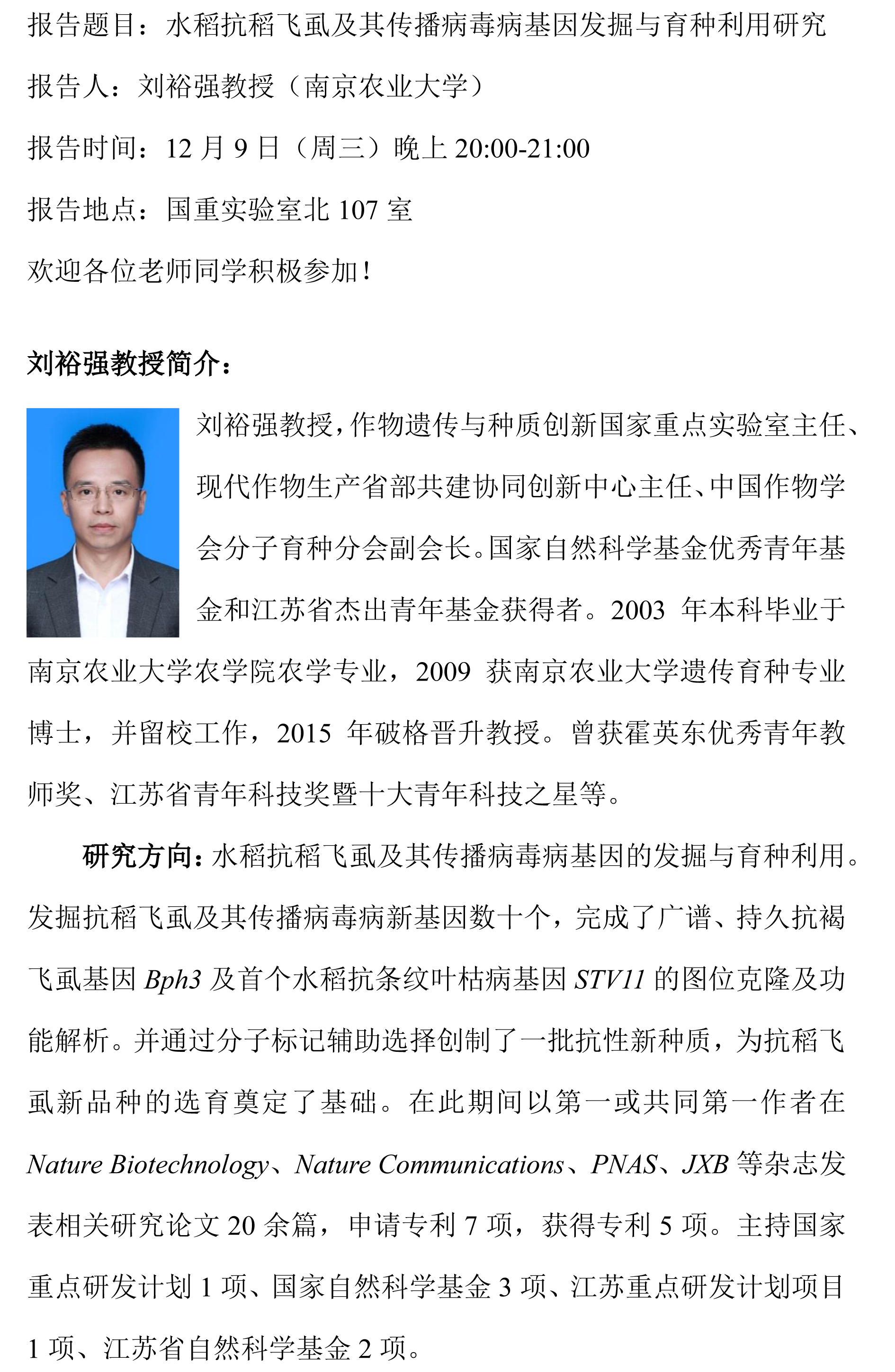 国重实验室学术报告:水稻抗稻飞虱及其传播病毒病基因发掘与育种利用研究