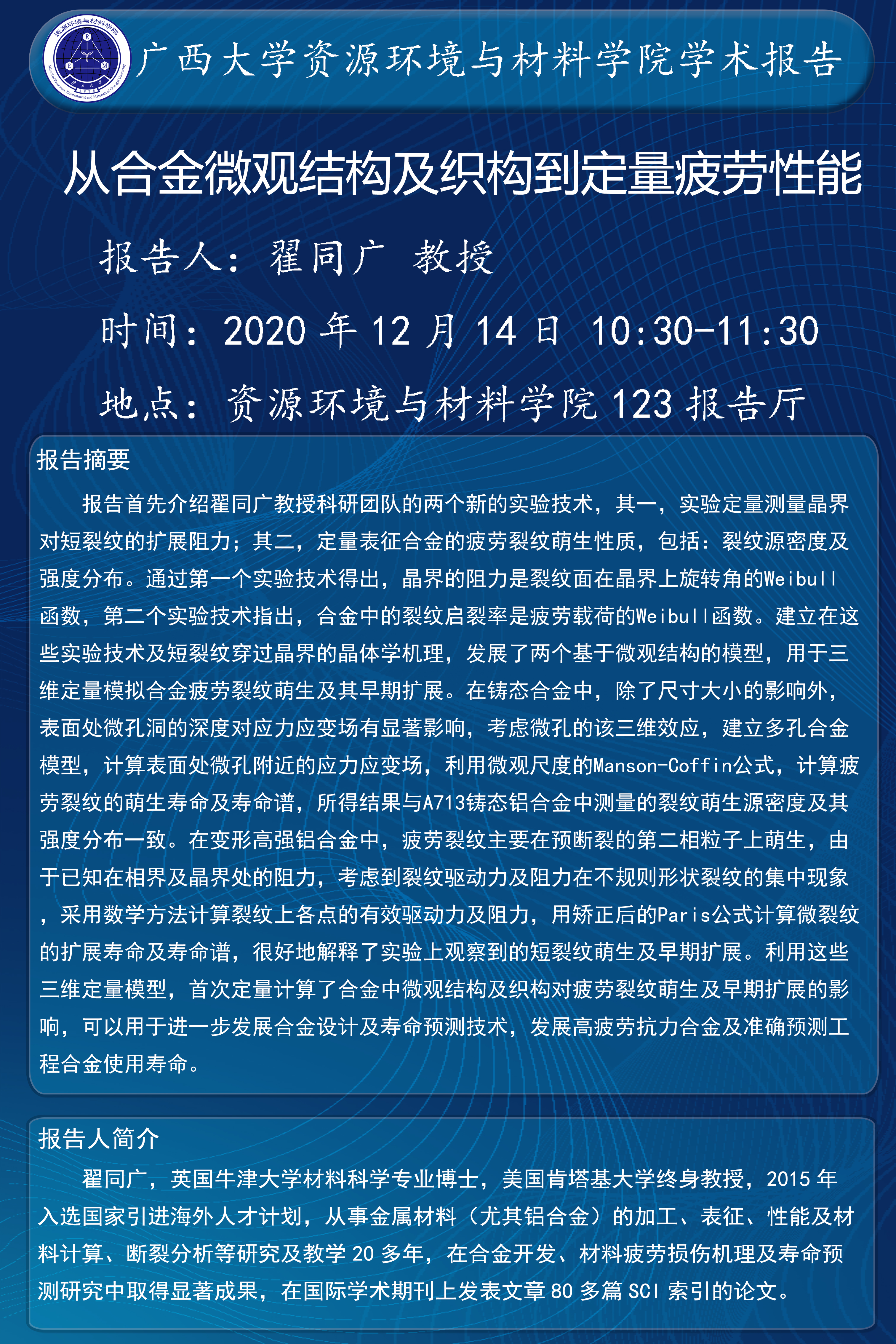 资源环境与材料学院学术报告:从合金微观结构及织构到定量疲劳性能