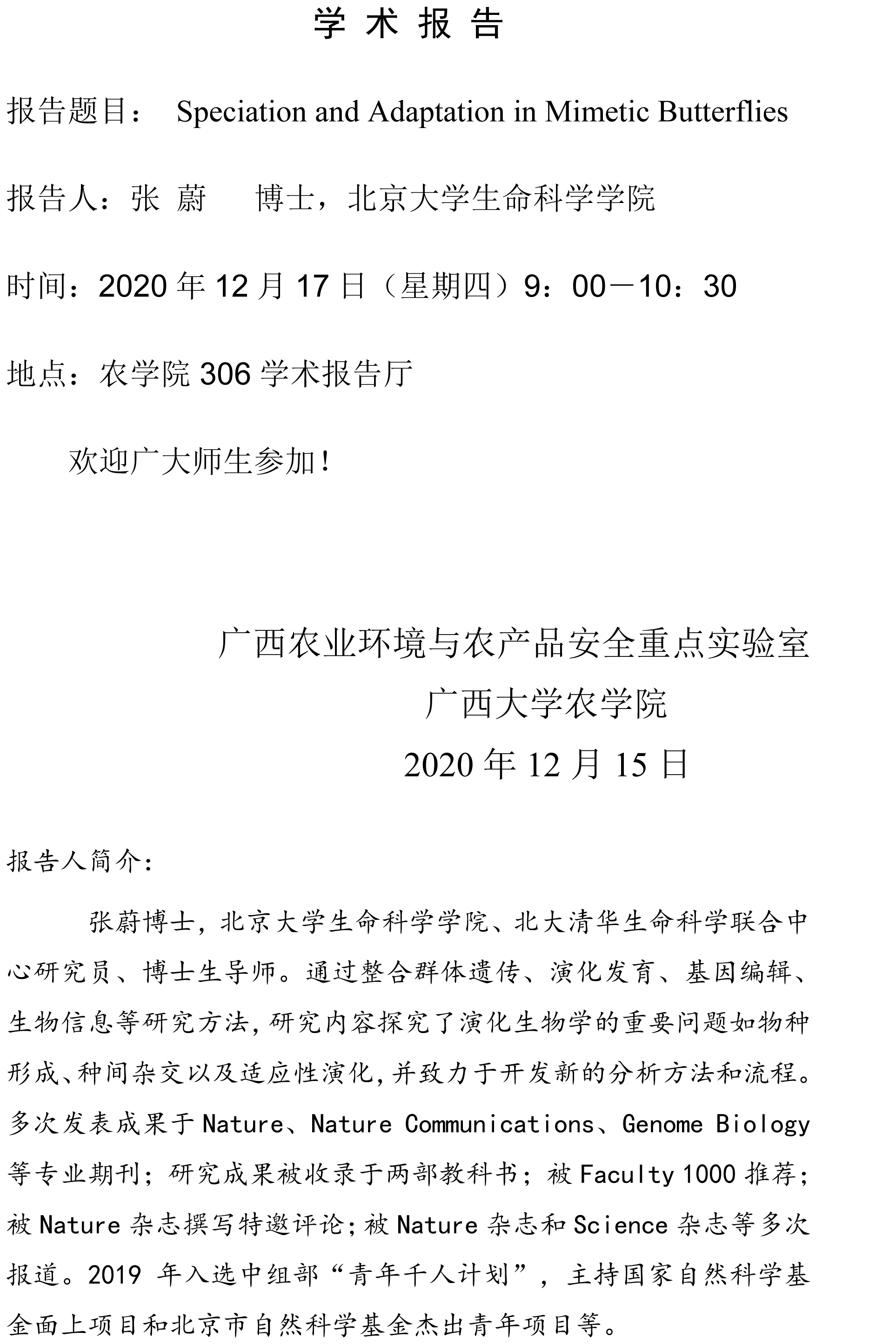 农学院学术报告:Speciation and Adaptation in Mimetic Butterflies