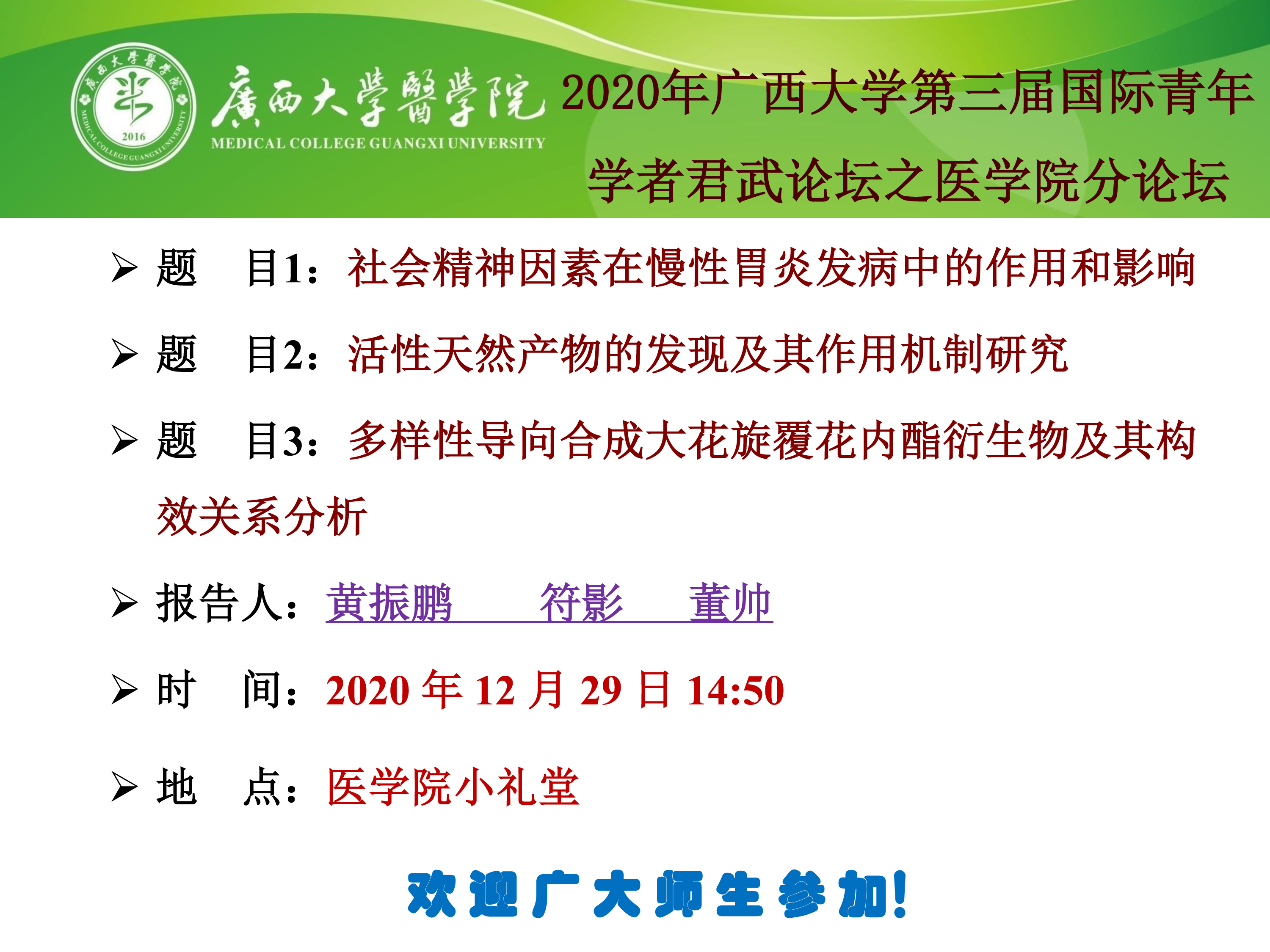 2020年Ky开元集团第三届国际青年学者君武论坛之医学院分论坛:社会精神因素在慢性胃炎发病中的作用和影响;活性天然产物的发现及其作用机制研究;多样性导向合成大花旋覆花内酯衍生物及其构效关系分析;