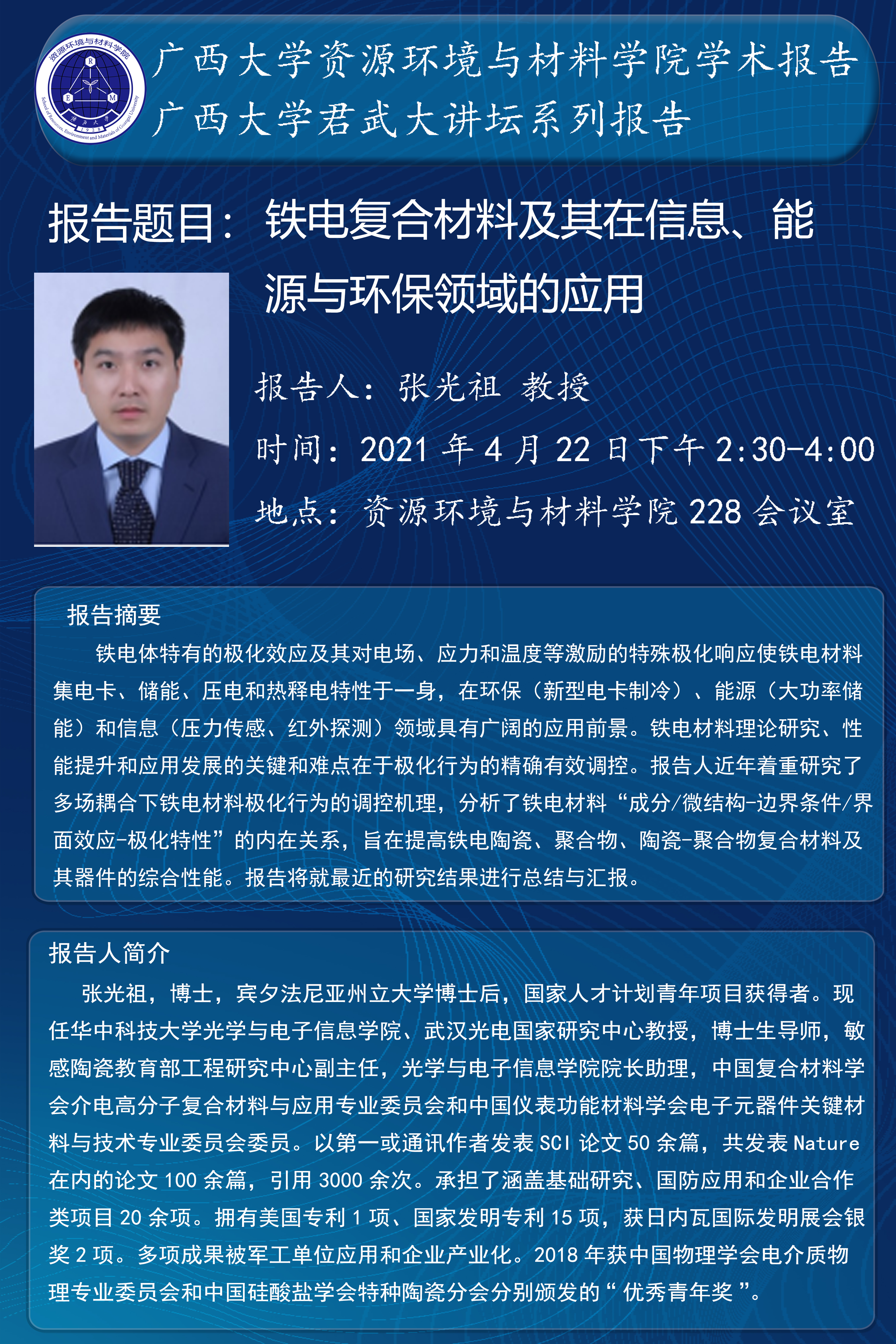 君武大讲堂-资源环境与材料学院学术报告:铁电复合材料及其在信息、能源与环保领域的应用