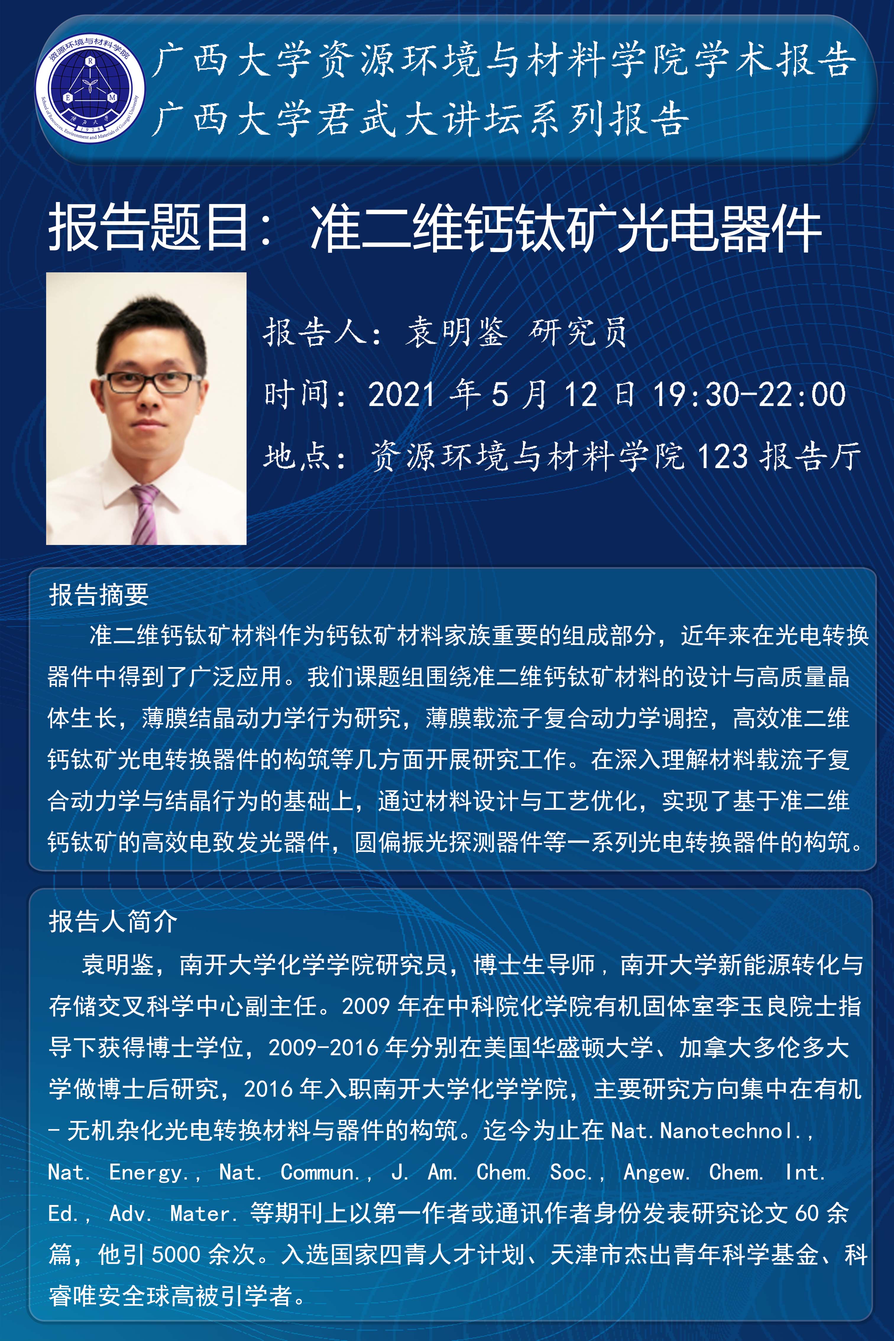 君武大讲堂-资源环境与材料学院学术报告:准二维钙钛矿光电器件