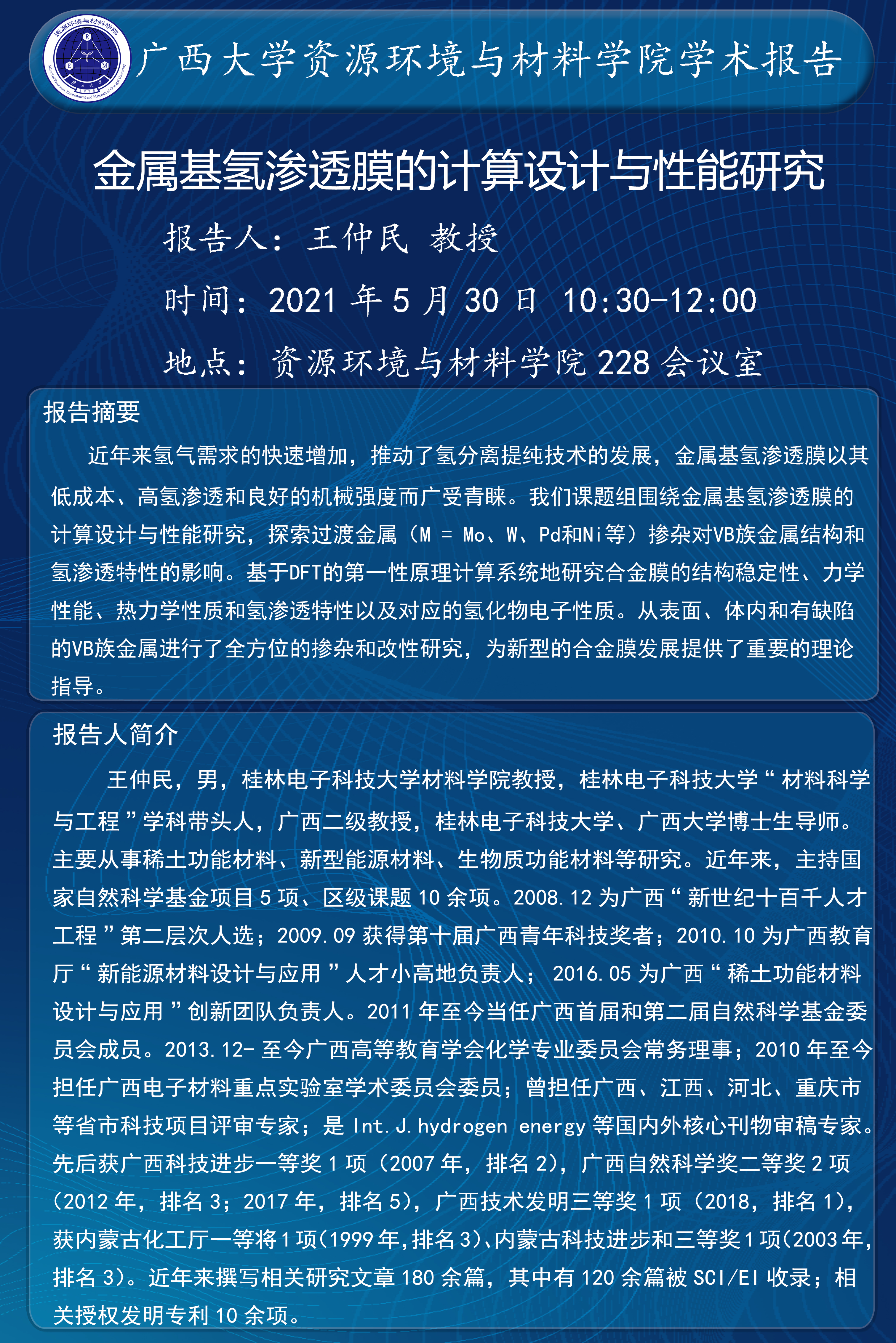 资源环境与材料学院学术报告:金属基氢渗透膜的计算设计与性能研究