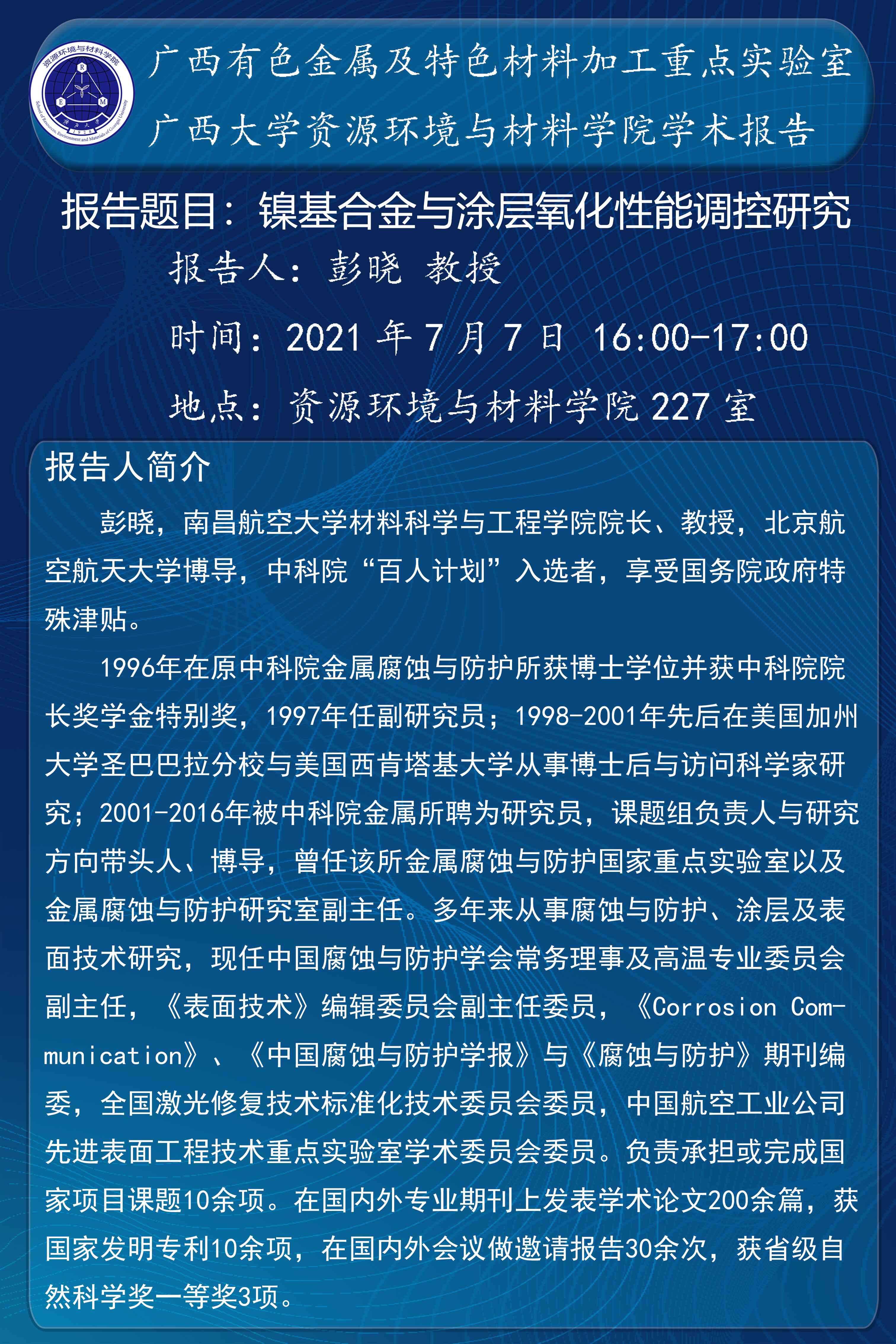 资源环境与材料学院学术报告:镍基合金与涂层氧化性能调控研究
