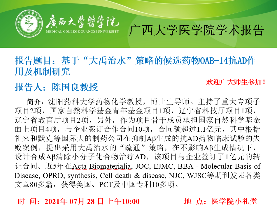 医学院学术报告:基于“大禹治水”策略的候选药物OAB-14抗AD作用及机制研究