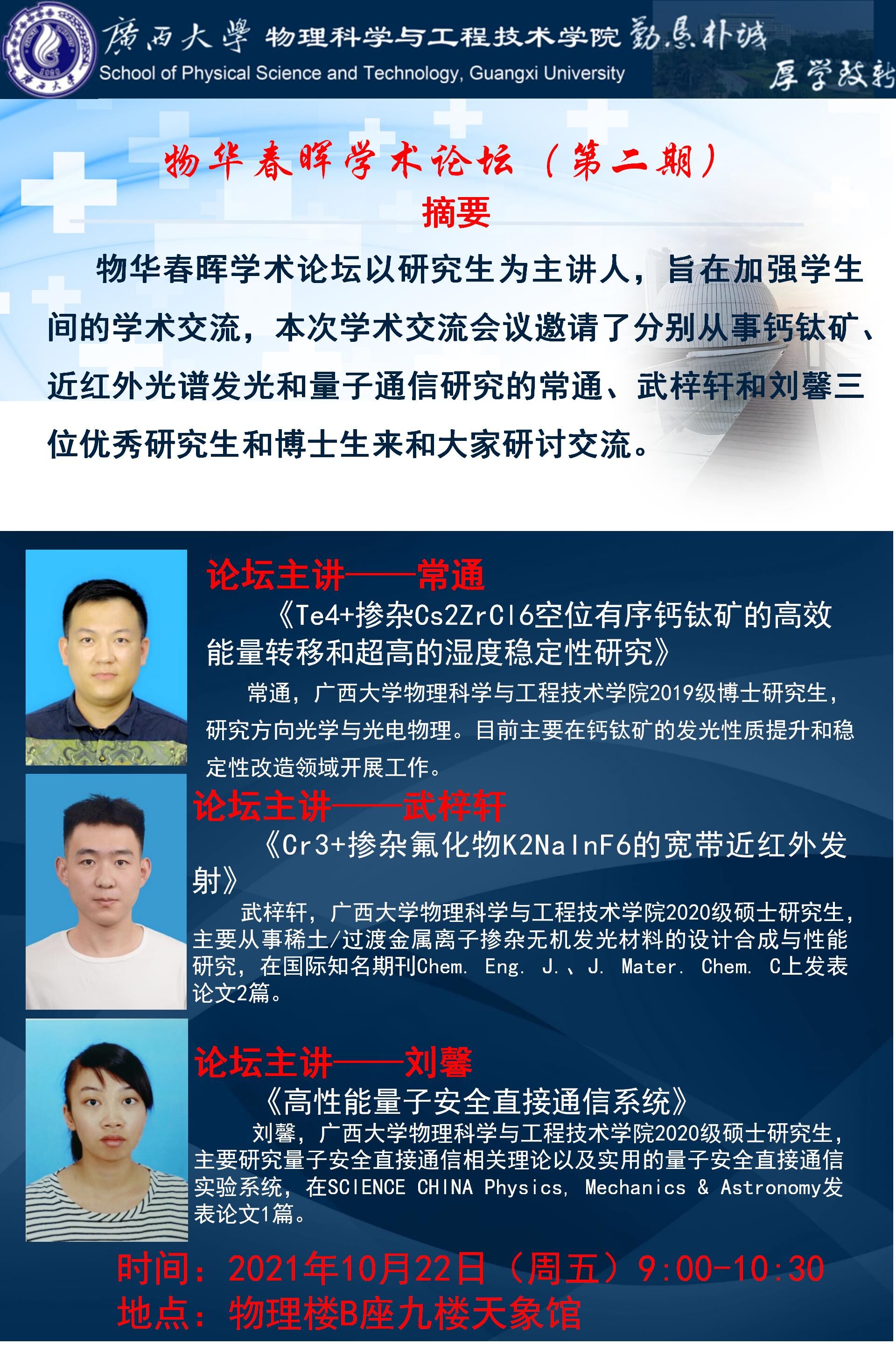 物华春晖学术论坛(第二期):Te4+掺杂Cs2ZrCl6空位有序钙钛矿的高效能量转移和超高的湿度稳定性研究;Cr3+掺杂氟化物K2NaInF6的宽带近红外发射;高性能量子安全直接通信系统