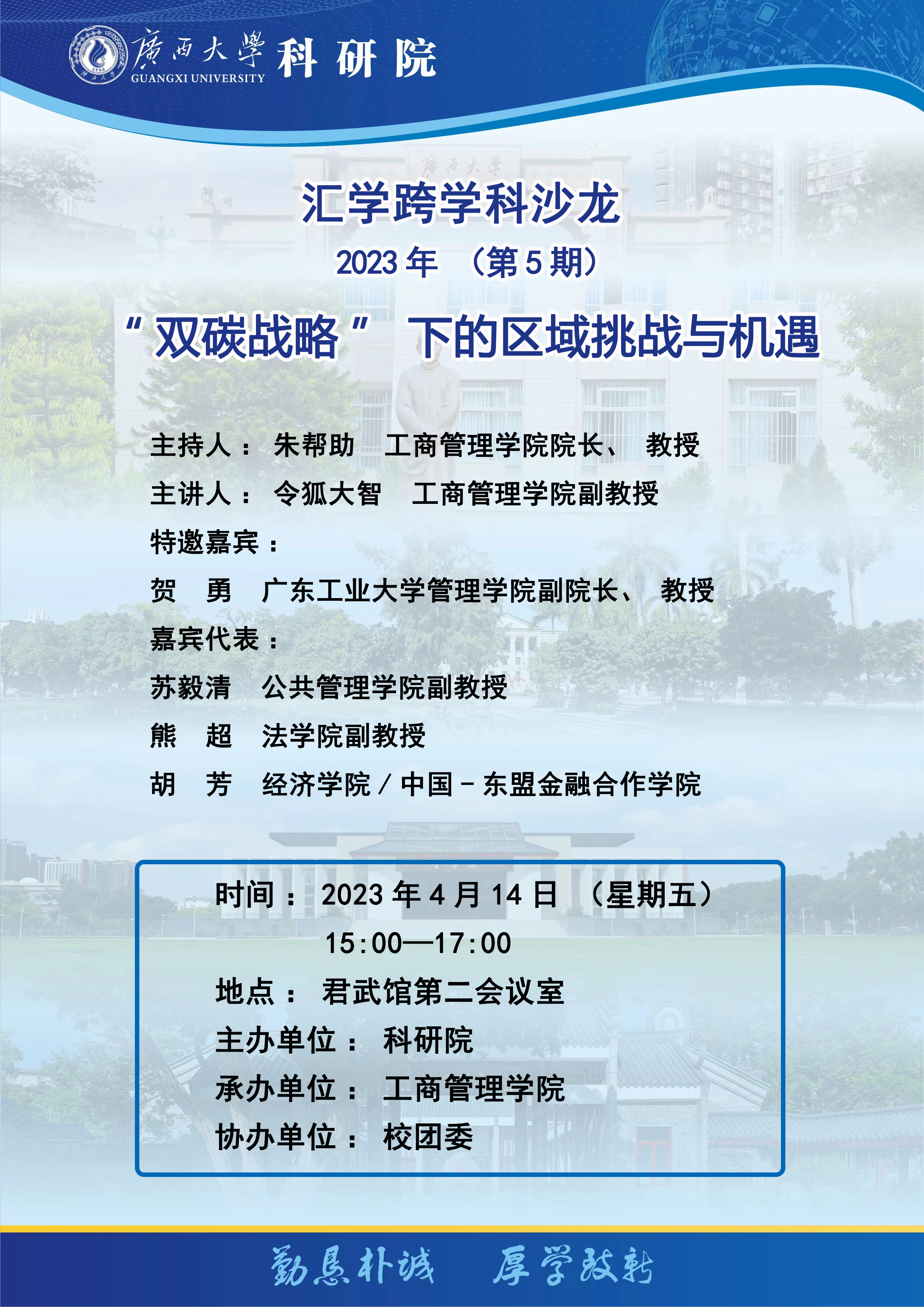 研讨内容:随着气候挑战加剧,早日实现碳达峰、碳中和成为全球各国的普遍关切。作为最大的发展中国家,我国政府于2020年提出“30·60”目标,为全球气候治理和命运共同体建设贡献力量。随后,中共中央、国务院连续出台的《关于完整准确全面贯彻新发展理念做好碳达峰碳中和工作的意见》和《2030年前碳达峰行动方案》强调各区域在实施“双碳”行动过程中“要坚持系统观念,处理好整体和局部的关系”,“结合区域重大战略、区域协调发展战略和主体功能区战略”,“坚持因地制宜、上下联动有序推进碳达峰”,“从实际出发推进本地区绿色低碳发展”。党的二十大报告进一步提出“协同推进降碳、减污、扩绿、增长”。“双碳战略”对国家经济社会发展提出新的要求和挑战。如何化挑战为机遇,协同推进经济发展、绿色发展和可持续发展,成为各区域在践行新发展理念、实现高质量发展时首需解决的问题。