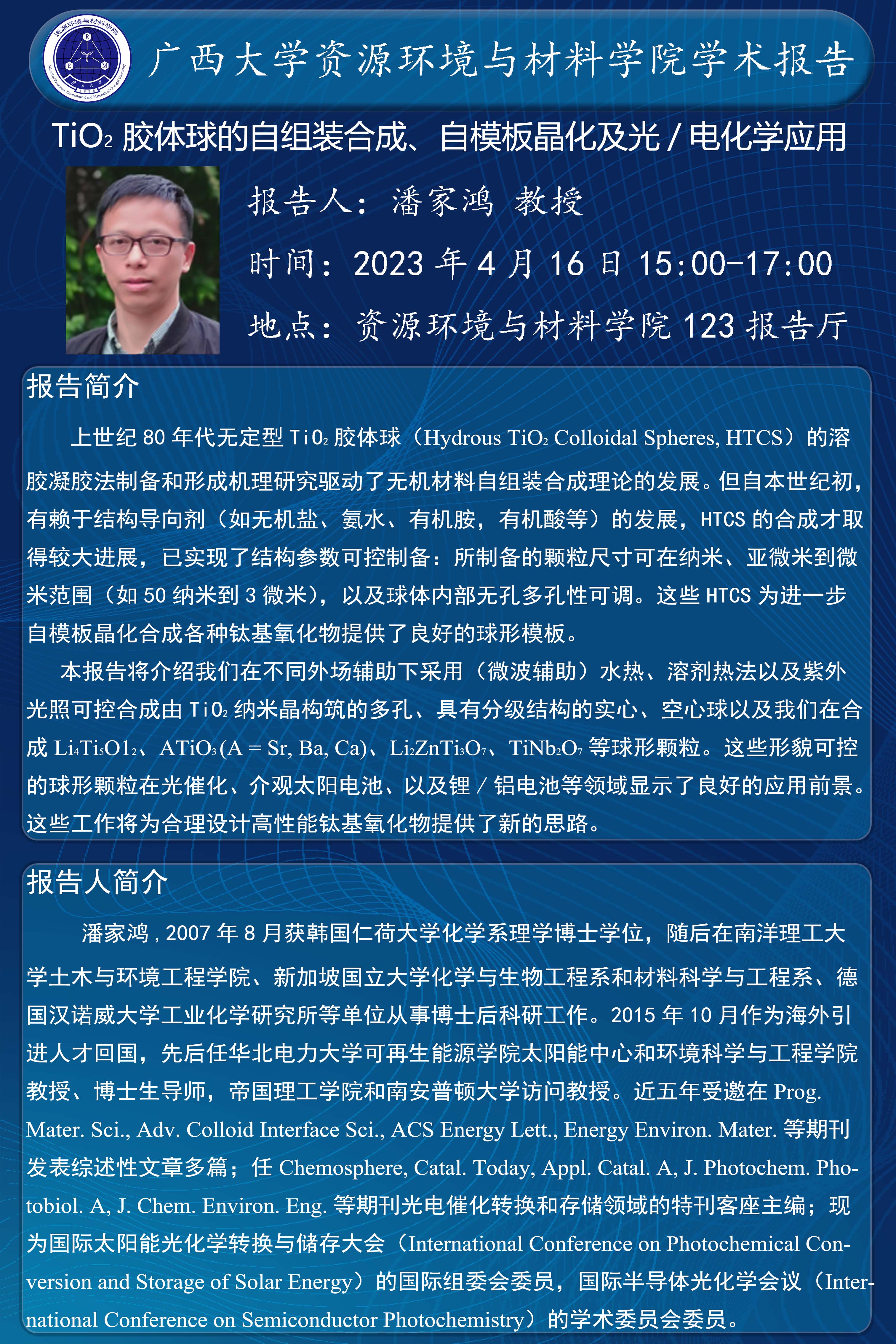 化学化工学院2023年学术报告(第二期):电解液调控稳定Zn离子电池