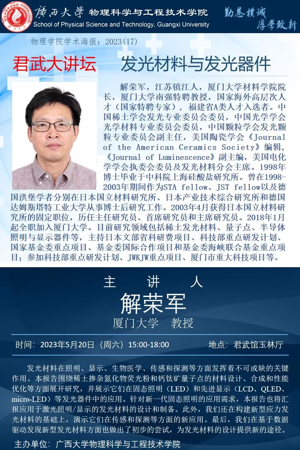 上一条:物理学院2023年学术报告系列之18:君武大讲坛——我们该如何做科研?做科研的苦恼和快乐