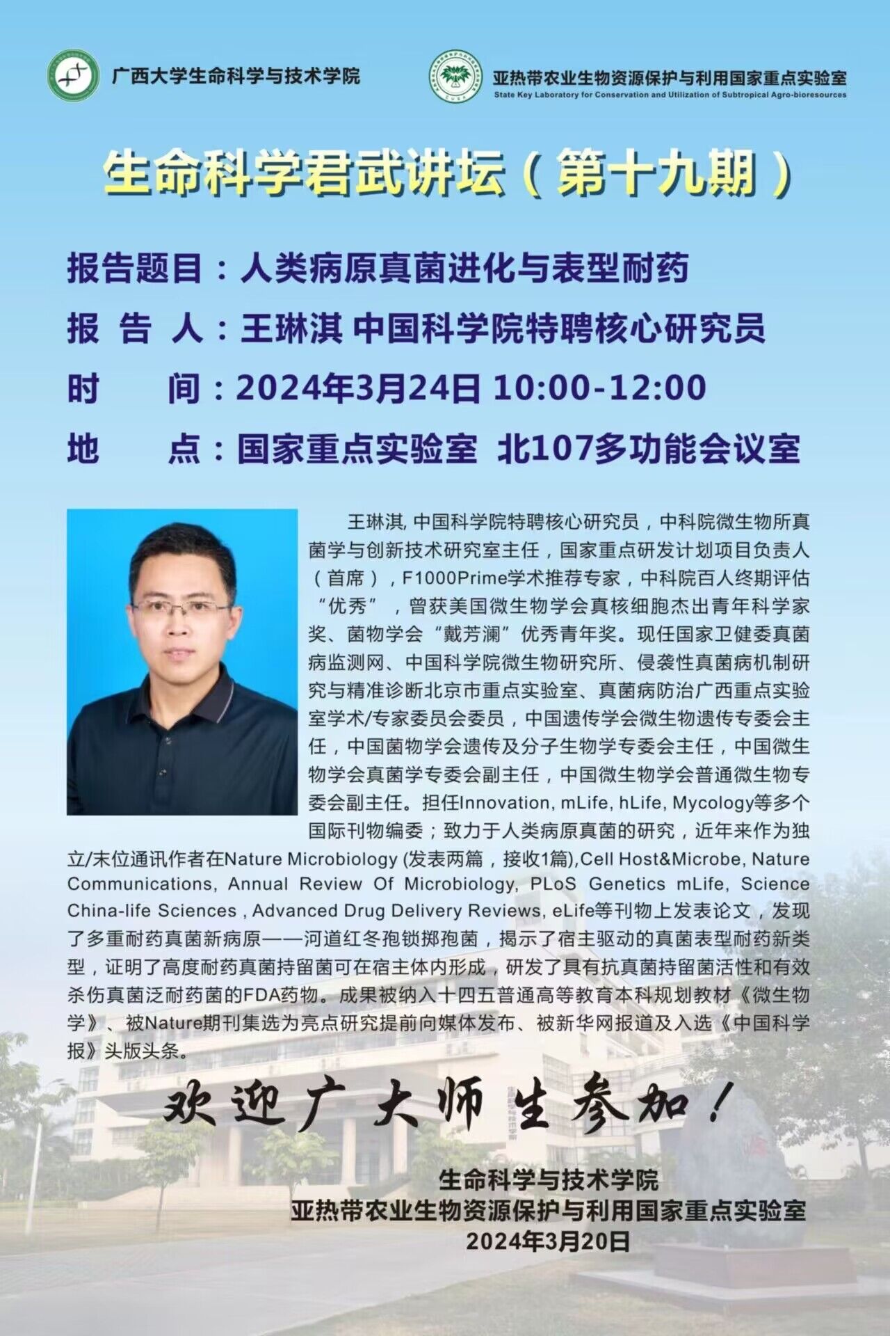 生命科学君武讲坛(第十九期):人类病原真菌进化与表型耐药