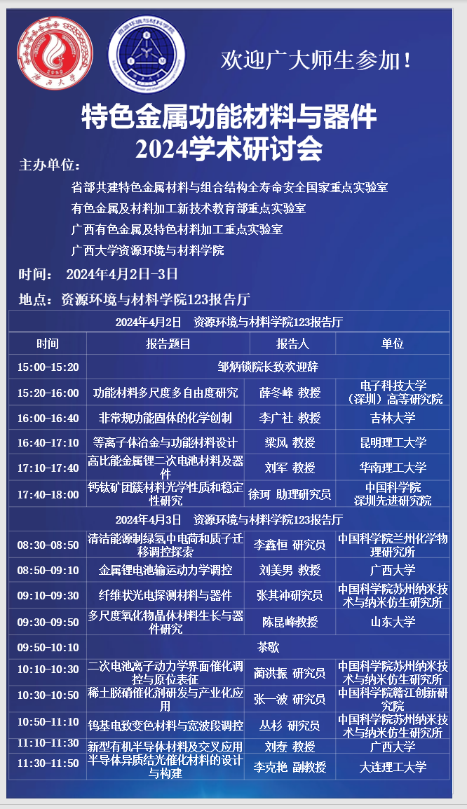 资源环境与材料学院:特色金属功能材料与器件2024学术研讨会