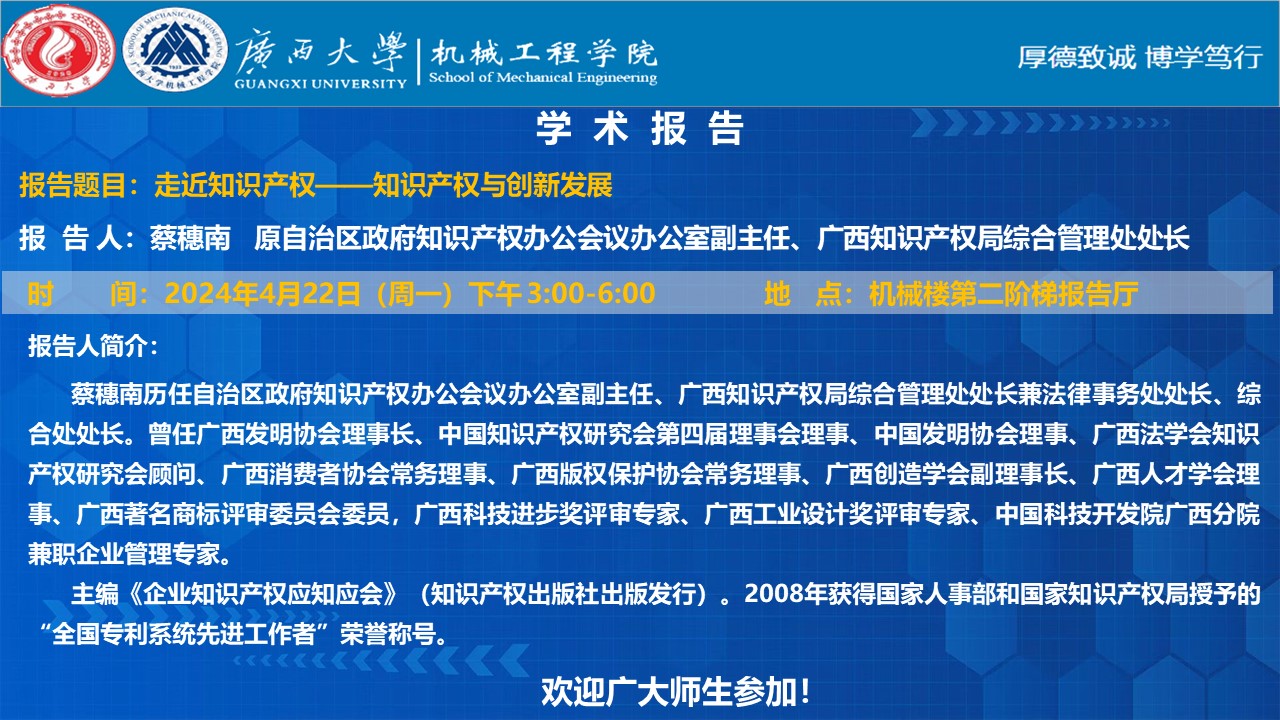 机械工程学院学术报告:走近知识产权——知识产权与创新发展