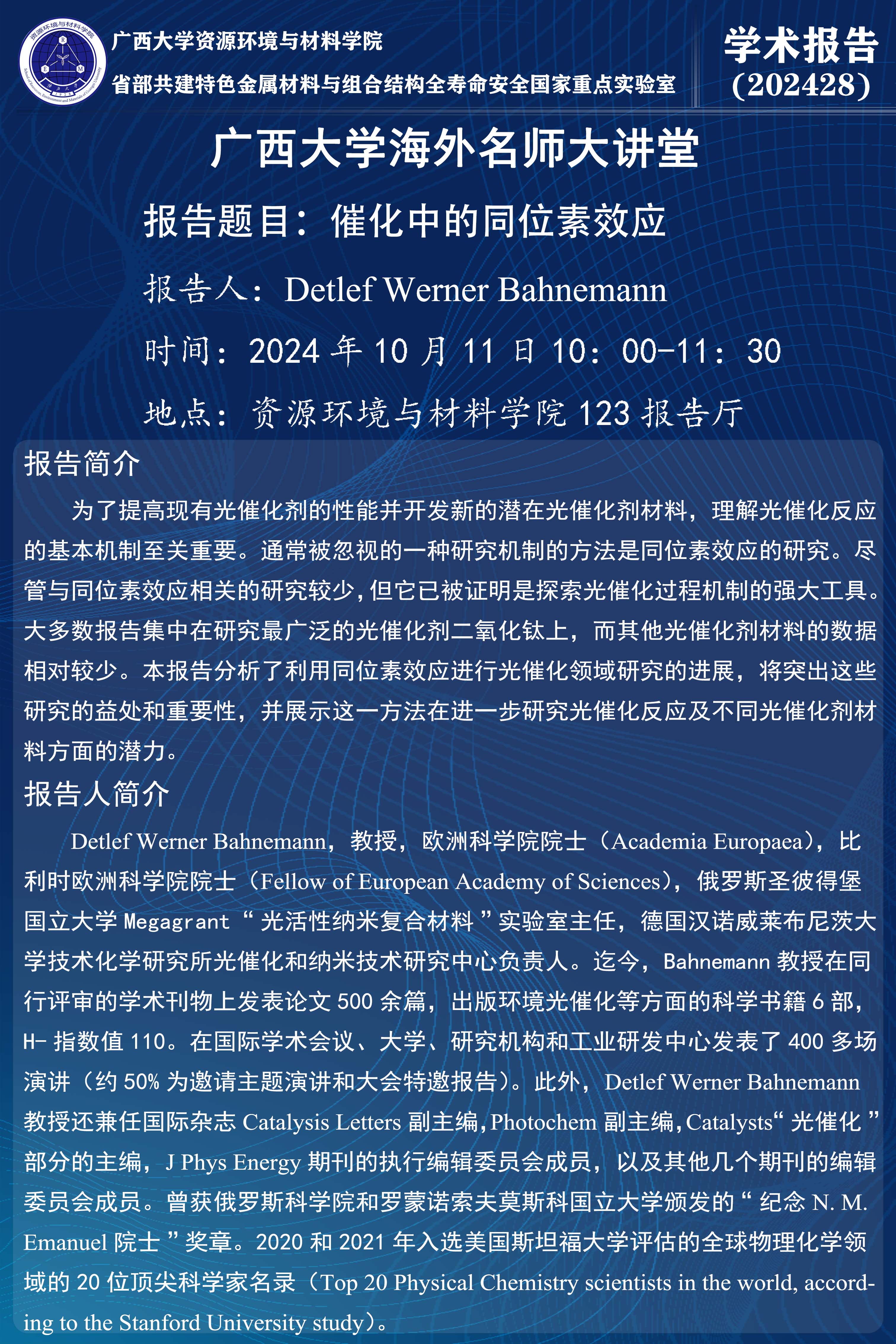 Ky开元集团海外名师大讲堂、资源环境与材料学院学术报告:催化中的同位素效应