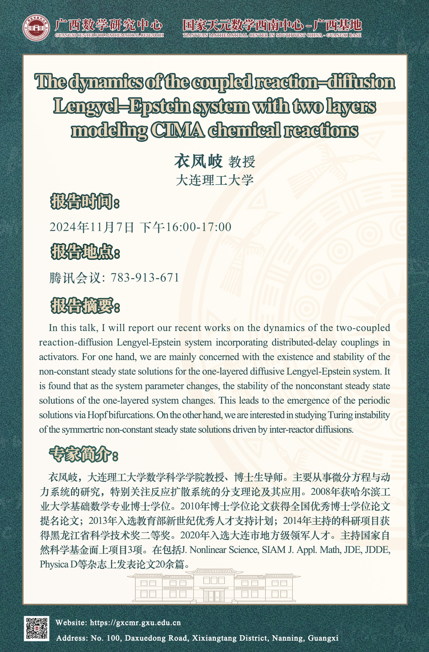 国家天元数学西南中心广西基地、广西数学研究中心学术报告:The dynamics of the coupled reaction-diffusion Lengyel-Epstein system with two layers modeling CIMA chemical reactions