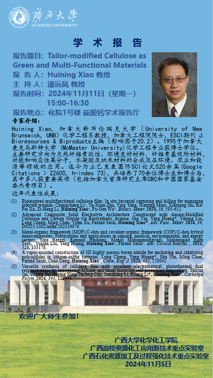 化学化工学院学术报告:Tailor-modified Cellulose asGreen and Multi-Functional Materials