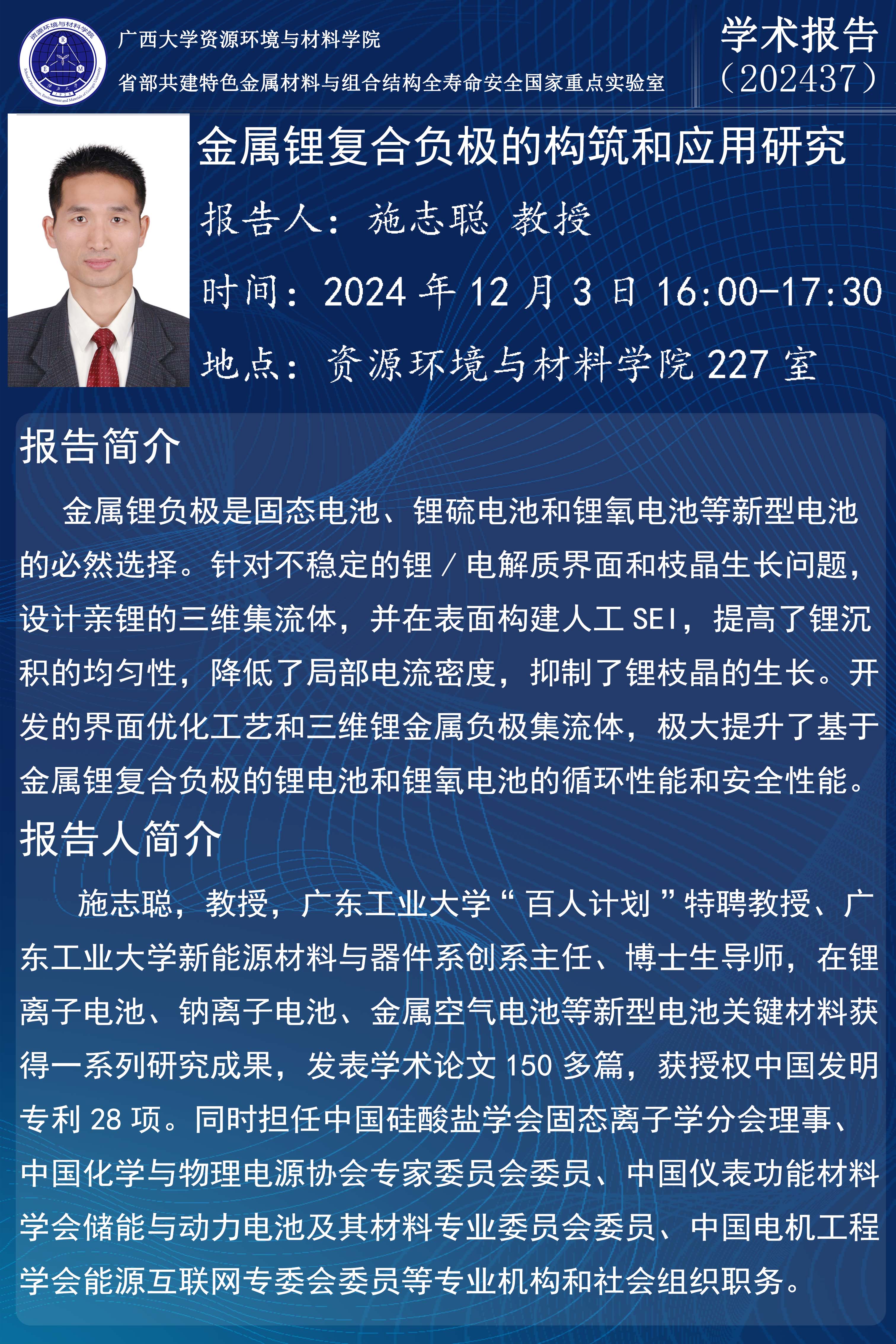 资源环境与材料学院学术报告:金属锂复合负极的构筑和应用研究