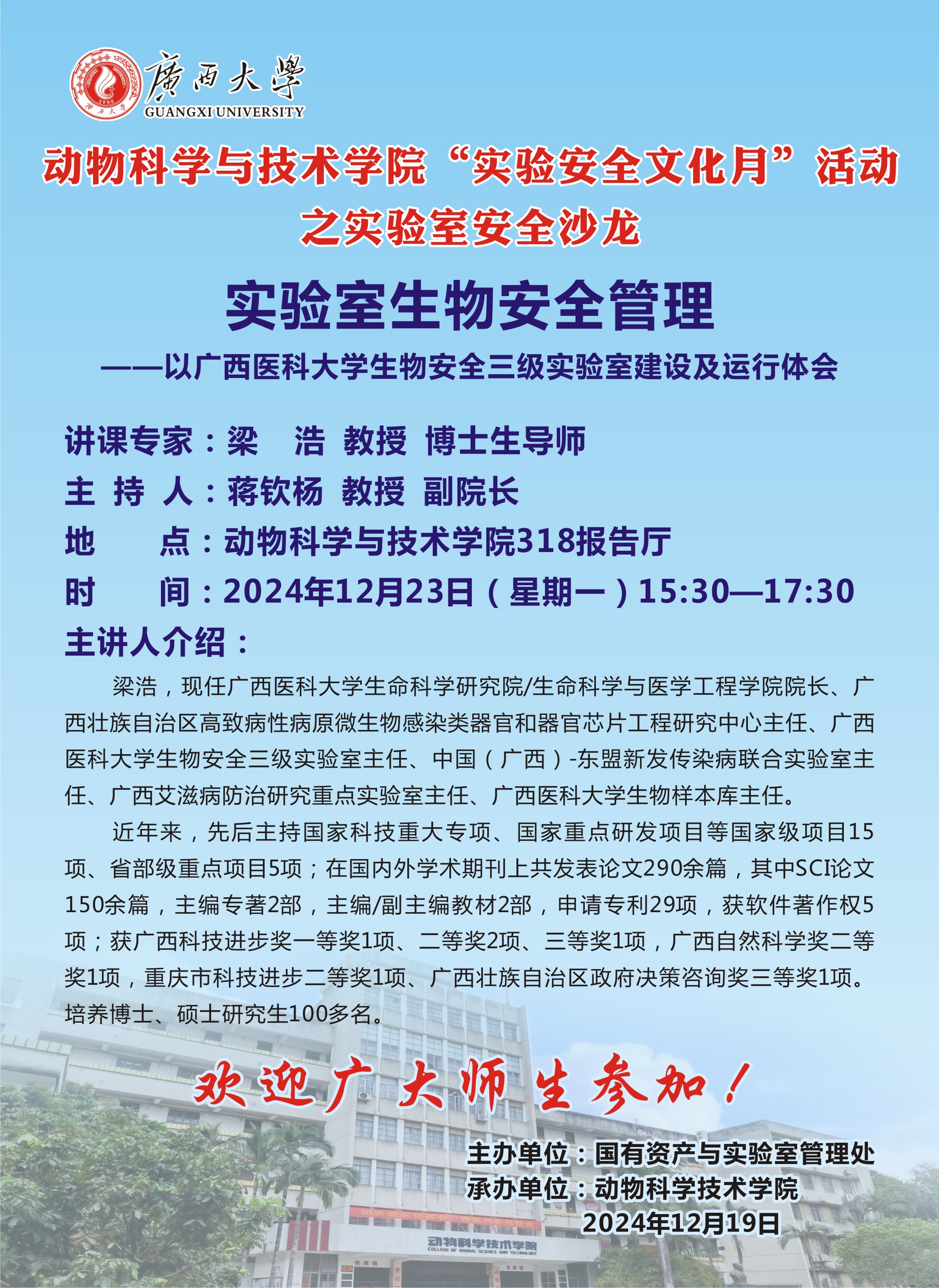 动物科学与技术学院“实验安全文化月”活动之实验室安全沙龙:实验室生物安全管理 ——以广西医科大学生物安全三级实验室建设及运行体会