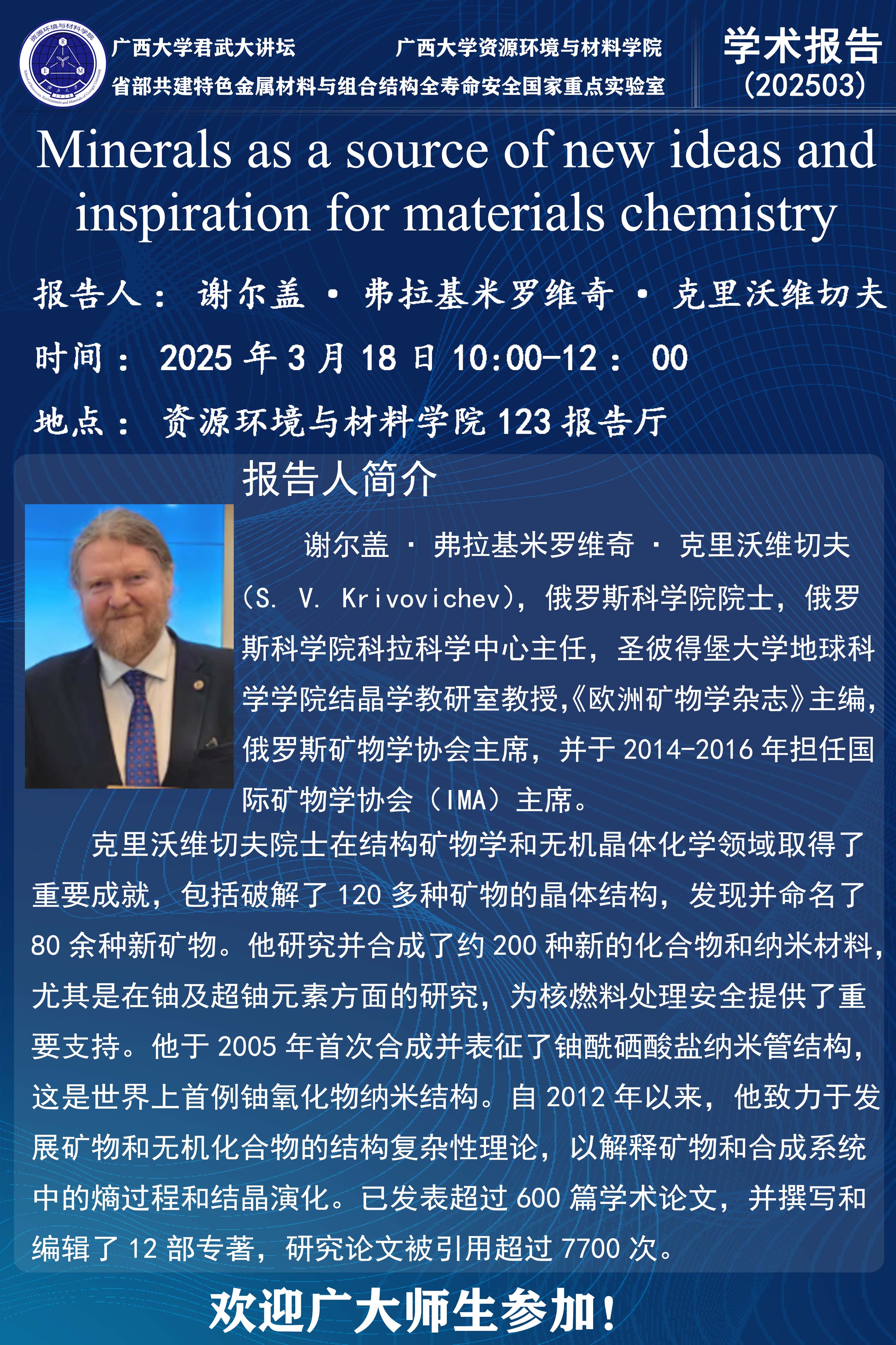 君武大讲坛、资源环境与材料学院学术报告:Minerals as a source of new ideas and inspiration for materials chemistry