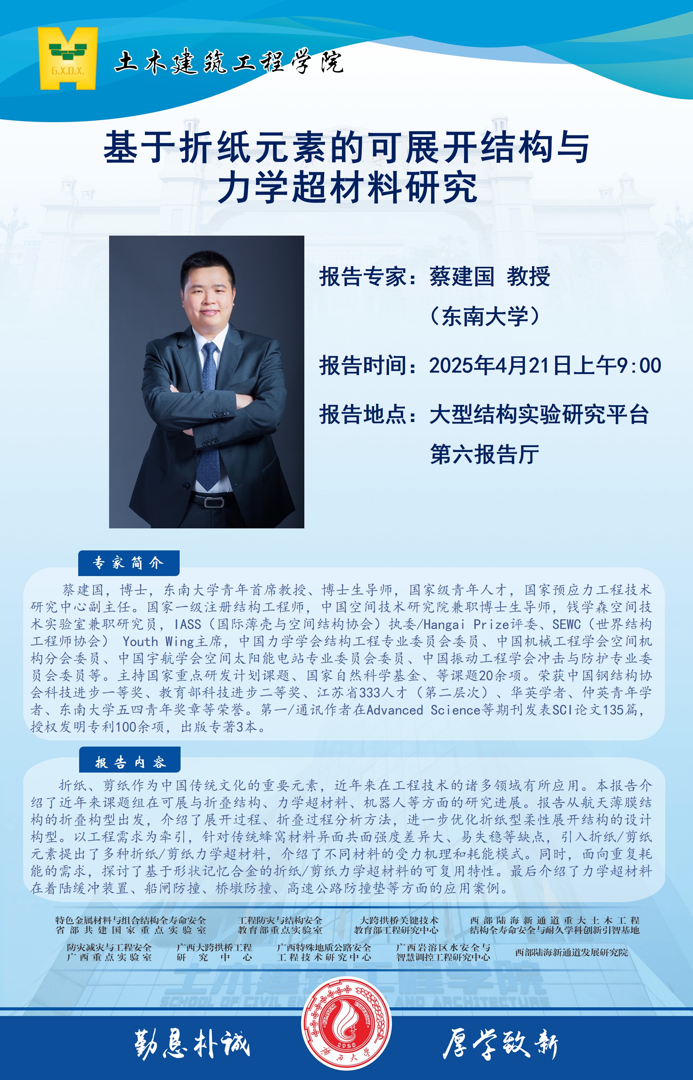 土木建筑工程学院学术报告:基于折纸元素的可展开结构与力学超材料研究