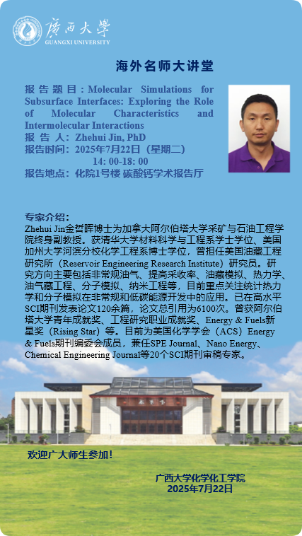 海外名师大讲堂、化学化工学院学术报告:Molecular Simulations for Subsurface Interfaces: Exploring the Role of Molecular Characteristics and Intermolecular Interactions