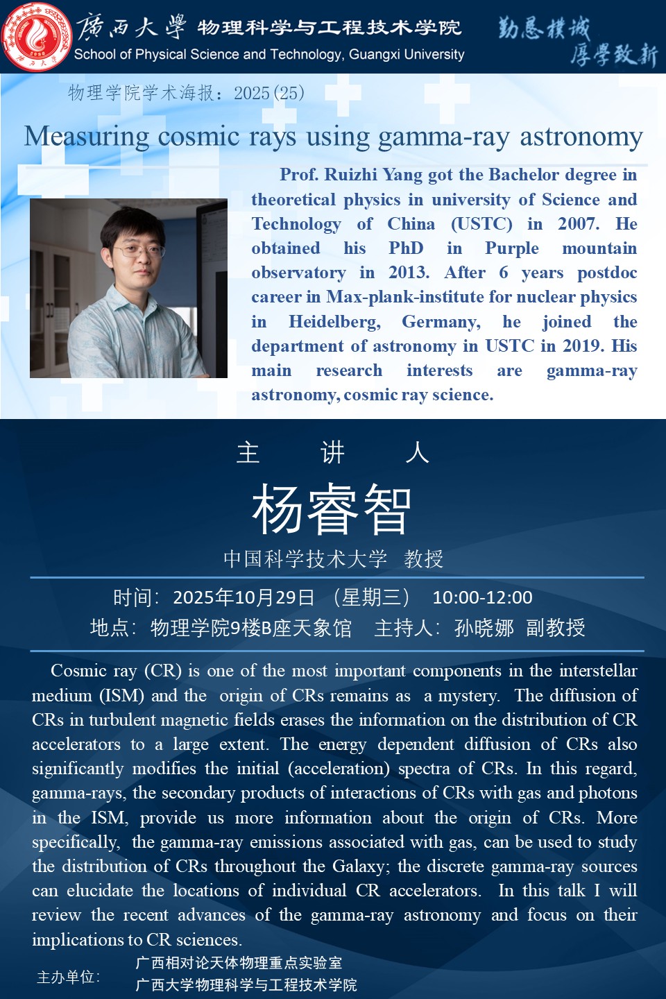 物理科学与工程技术学院学术报告:Measuring cosmic rays using gamma-ray astronomy
