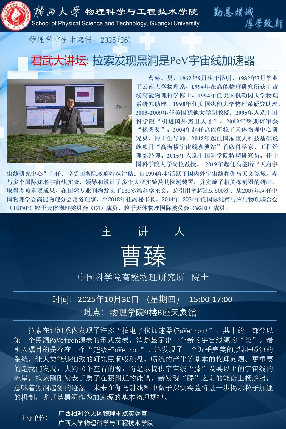 君武大讲坛、物理科学与工程技术学院学术报告:拉索发现黑洞是PeV宇宙线加速器