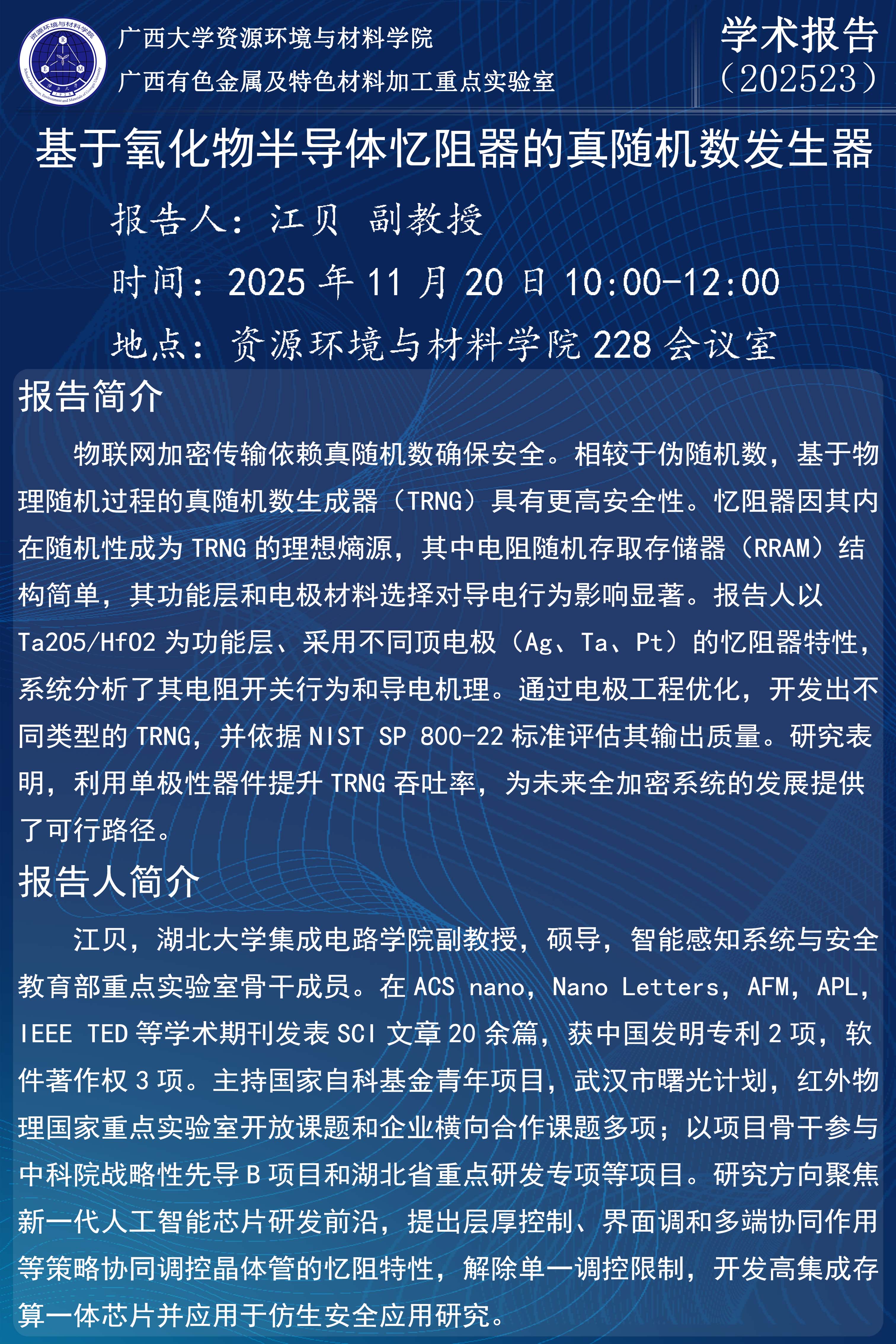 资源环境与材料学院学术报告:基于氧化物半导体忆阻器的真随机数发生器