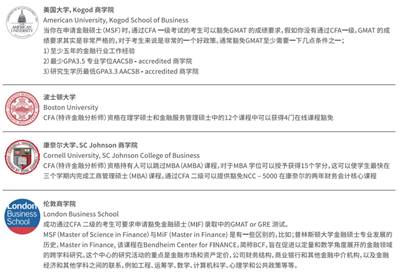国外商科名校(如波士顿大学,康奈尔大学,伦敦商学院,多伦多大学等)的商学院在接受留学申请时,针对通过CFA阶段性考试的学生可相应豁免其关于GMAT的成绩要求,个别院校可允许部分课程豁免。