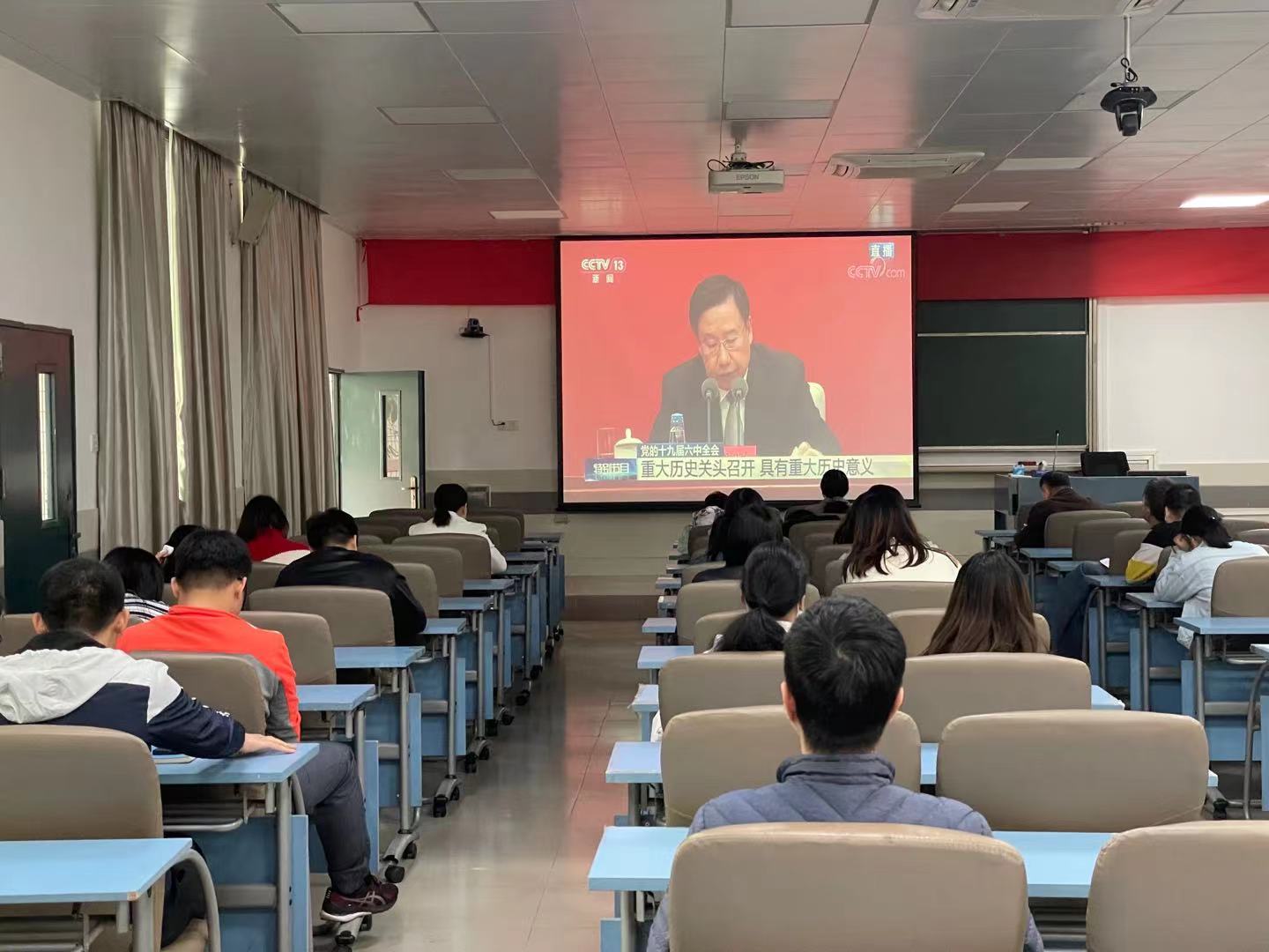 11月12日上午10点,中共中央举行新闻发布会,介绍党的十九届六中全会精神。为深入学习领会党的十九届六中全会精神,万象城体育awcsportallwincity万象城教工支部组织全体教工党员,在北教B201收看了此次新闻发布会。