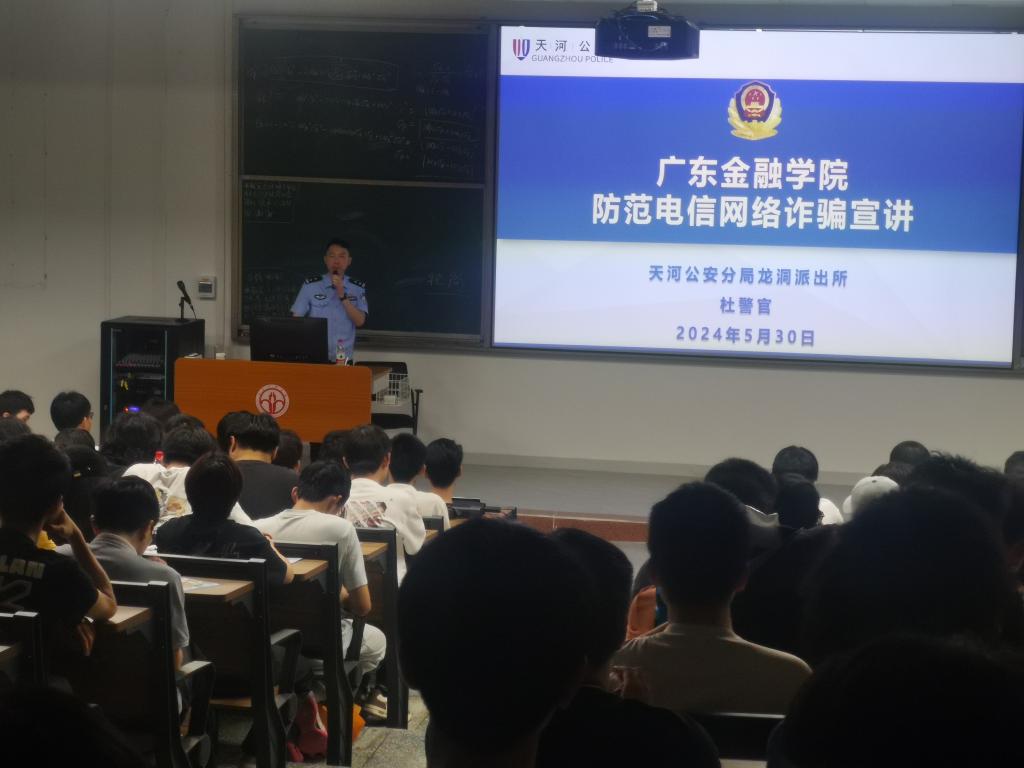 本次宣讲由天河公安分局龙洞派出所杜警官宣讲。宣讲会主要围绕冒充公检法、刷单返利、冒充电商物流客服、交友情感诈骗、虚假网络投资理财等十大发高发诈骗类型,增加同学们对诈骗套路的了解,引导同学们加强对网络诈骗案例的关注度,吸取真实案例的经验教训,进一步提高了同学们的诈骗辨识能力。希望同学们在日常生活中提高警惕性,所有转账汇款一律不转;所有网络赌博一律不碰;所有不明链接一律不点;所有可疑人员一律不理会;所有违法乱纪活动一律不参加,做好自我防范,杜绝上当受骗。