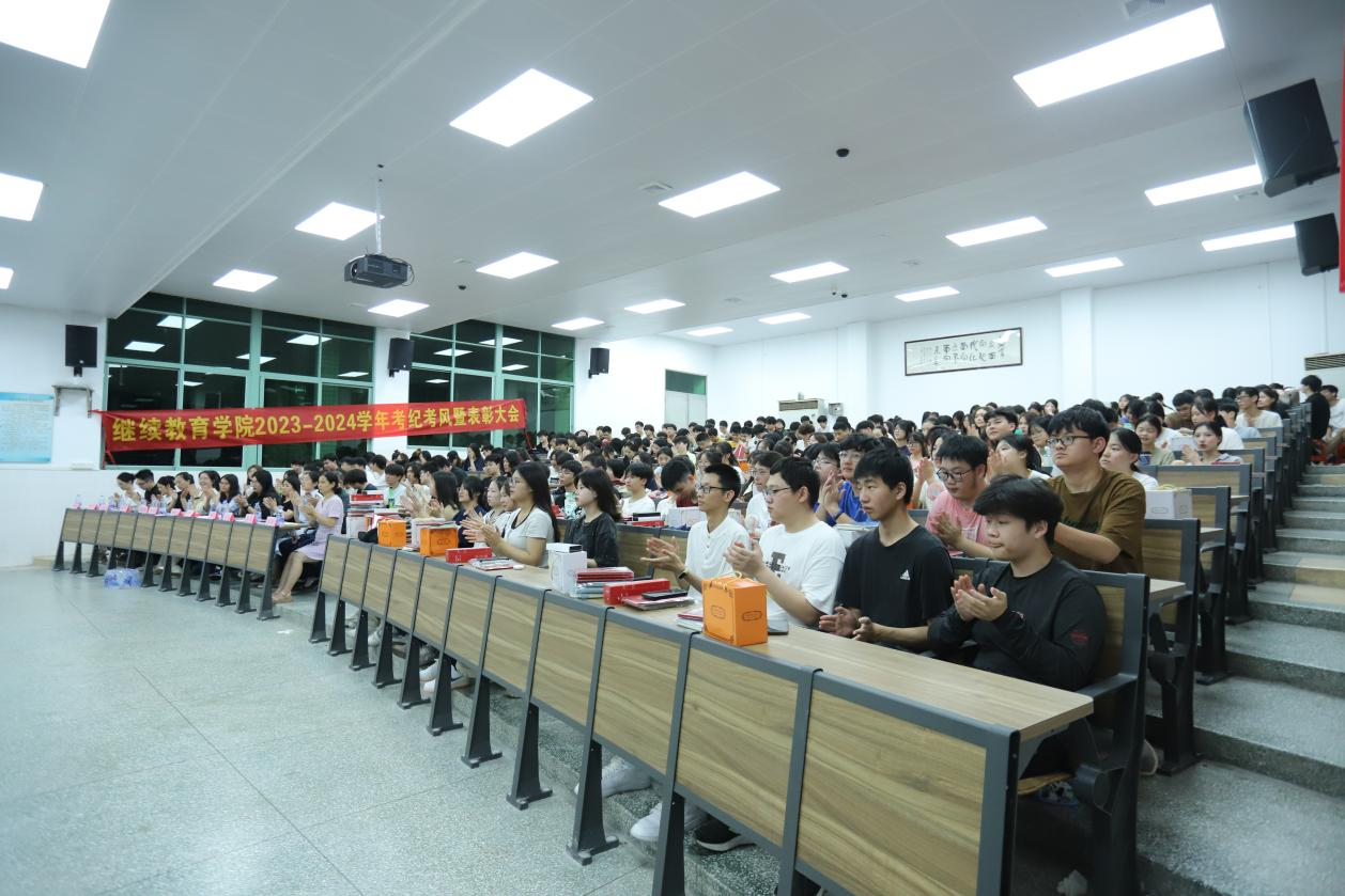 2024年6月25日下午,万象城在6栋教学楼401课室召开2023-2024学年考纪考风暨表彰大会。allwincity万象城詹鑫副书记、谢飞玲老师、自考项目全体老师以及300余名学生参加会议。