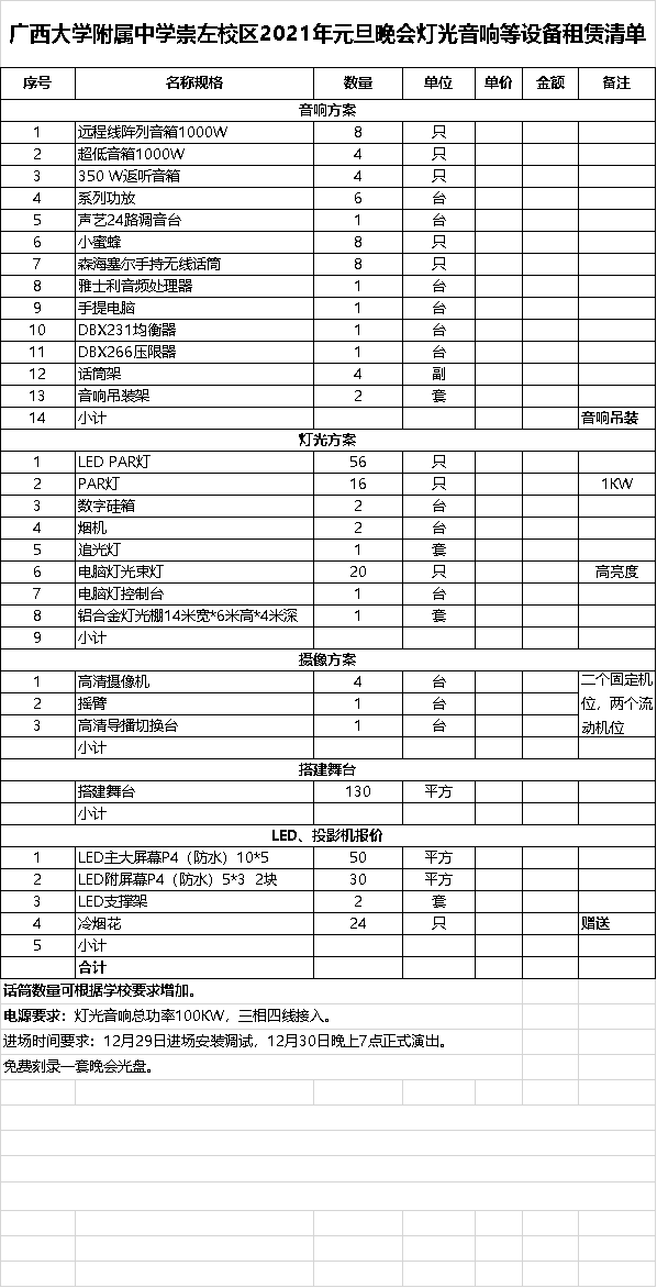 Ky开元集团附属中学(南宁校区)2021年元旦晚会灯光音响等设备租赁清单 |