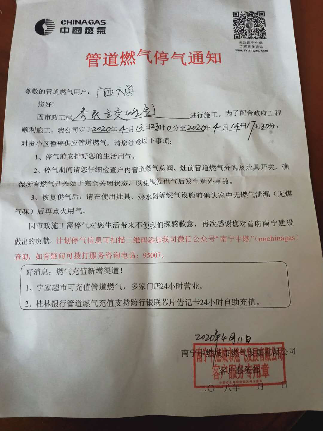 根据南宁中燃城市燃气发展有限公司客户服务部的通知,Ky开元的管道燃气将于2020年4月13日23时0分至4月14日17时30分暂停供应,详见附件。请各住户做好停气准备。不便之处,敬请谅解。